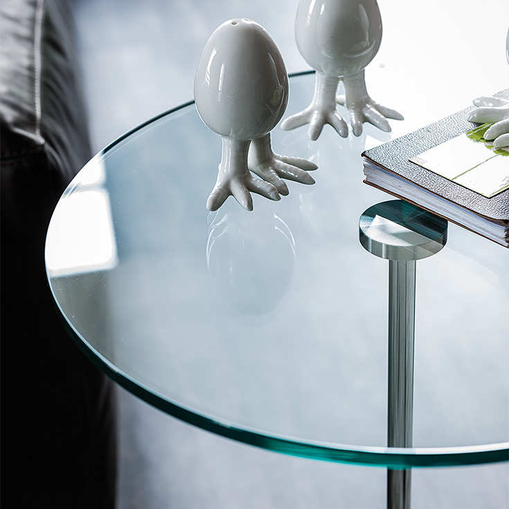 Gliss are elegant and practical modern round tables for furnishing a functional design living room. They are perfect placed next to a sofa or an armchair for keeping your items comfortably within reach. The Gliss models consist of a round base in polished stainless steel, surmounted by a chromed steel stem and a round top. The latter is available in glass and entirely in steel. The side tables Gliss are versatile complements, in fact by combining several tables of different sizes it is possible to create a composition that gives rhythm and dynamism to the room
