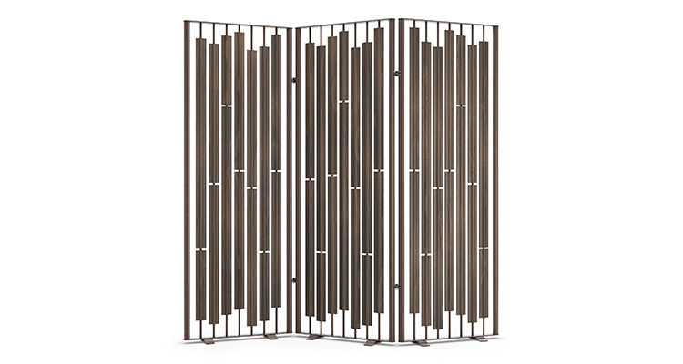 Modular screen with swiveling parts in Canaletto walnut stained ashwood (frNC) or burned oak stained ashwood (frRB) and structure in titanium (GFM11) or bronze (GFM18) embossed lacquered steel.