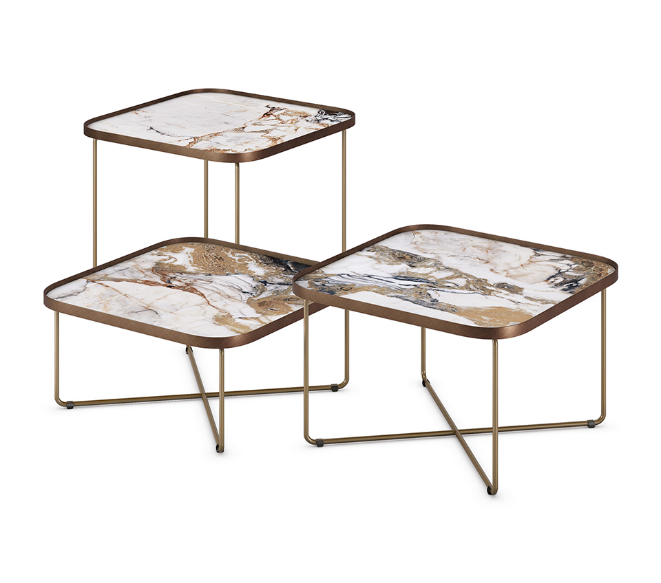Coffee table with frame in embossed titanium (GFM11) or black (GFM73) lacquered steel, or with base in Bronze and Brushed Bronze top frame. Marmi Alabastro (KM02), matt Golden Calacatta (KM05), glossy Golden Calacatta (KM06), matt Portoro (KM07), glossy Portoro (KM08), glossy Sahara Noir (KM09), Makalu (KM11), Breccia (KM12), Kaindy (KM16)or Colosseo (KM21) ceramic top. Colour and brushing variations of the Brushed finish are characteristics of the handcrafted processing and should not be considered as defects.