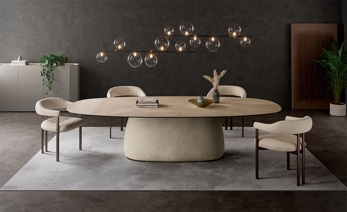 Experiencing the sculptural charm of a unique piece, where the handmade effect enhances its rich, multifaceted texture, is now possible. The tabletop is available in ceramic and wood, materials chosen to ensure the perfect balance between aesthetics and performance, perfectly suited to sophisticated design interiors.
