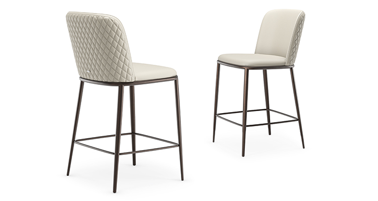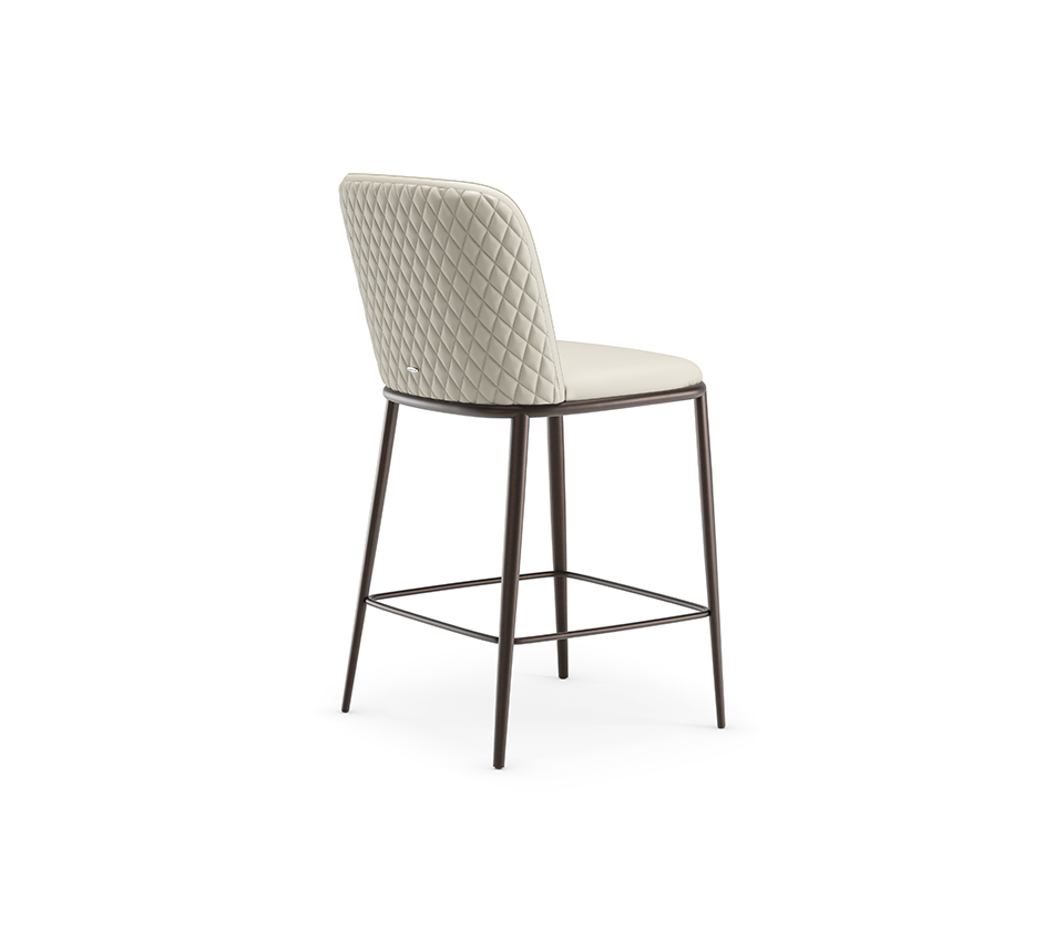 Stool with or without arms with frame in titanium (GFM11), bronze (GFM18), graphite (GFM69), pearl (GFM70) or black (GFM73) embossed lacquered steel. Cover in micro nubuck, soft leather or synthetic leather as per sample card. Quilted seatback cover. The cover is not removable.
