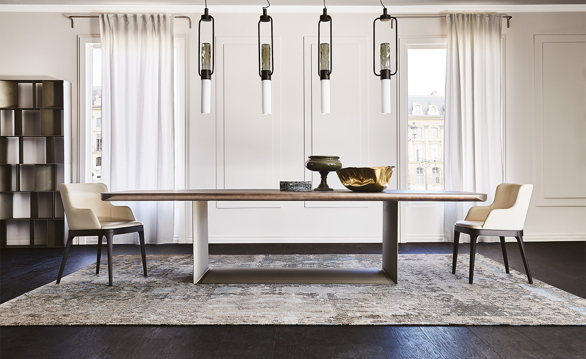 The Dragon family of rectangle dining tables is the perfect match between edges and roundness. The base of this design table divides the dining room with precision and grace at the same time. The rigorous structure is softned by the curvy shield and the game of lights that is reflected on the laquered steel base.