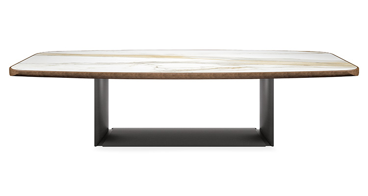 Table with titanium (GFM11), bronze (GFM18), graphite (GFM69), pearl (GFM70) or black (GFM73) embossed lacquered steel base. Top in ceramic Marmi Alabastro (KM02), matt Golden Calacatta (KM05), glossy Golden Calacatta (KM06), matt Portoro (KM07), glossy Portoro (KM08), glossy Sahara Noir (KM09), Makalu (KM11), Breccia (KM12), Borghini Calacatta opaco (KM18), Borghini Calacatta lucido (KM19), Colosseo (KM21), Andromeda (KM22), matt Invisible (KM24) or Luxor (KS23) with Brushed Bronze or Brushed Grey lacquered and rounded lower profile. 6cm thick top on 300x128 version and 5cm on 200x120 and 240x120 versions. Colour and brushing variations of the Brushed finish are characteristics of the handcrafted processing and should not be considered as defects.