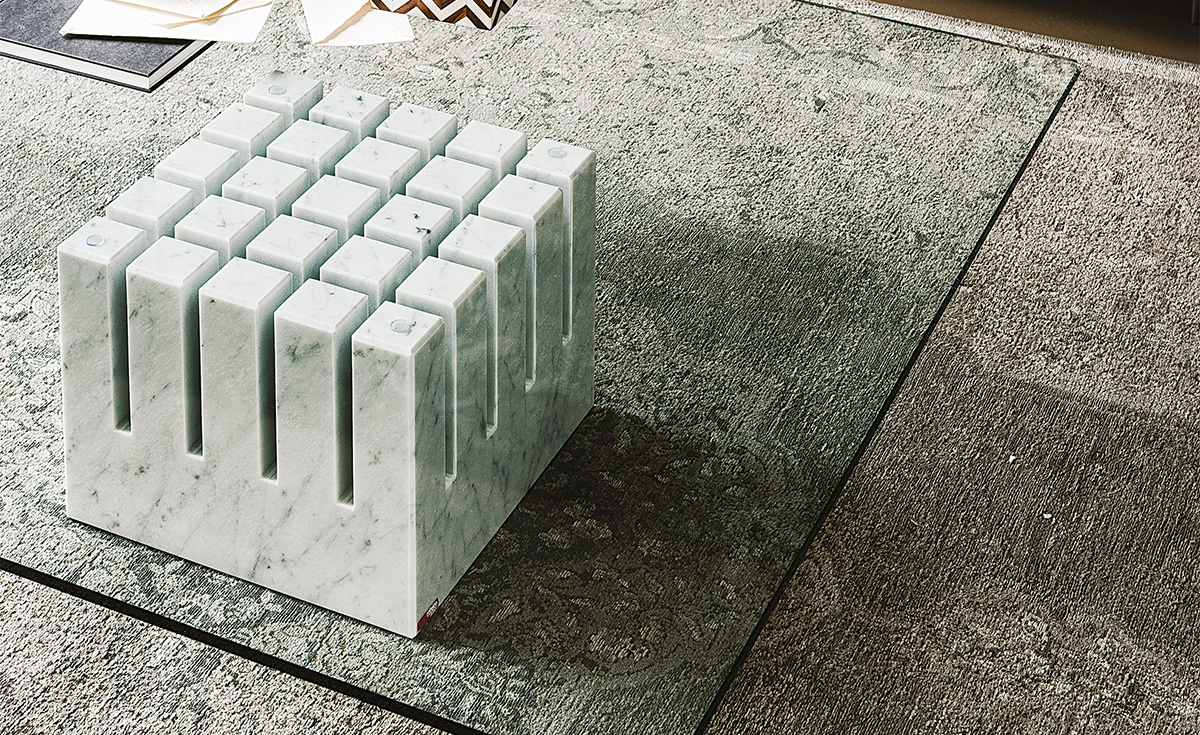 Scacco is one of the company's most long-lived and iconic products. A glass coffee table for the living room with an incisive sculptured character that becomes the undisputed star in a design living room. The sensational square marble base, worked with the best Made in Italy techniques, offers a three-dimensional geometric design, all to be admired. In fact, the transparent glass table top lets you appreciate the fine base in its entirety.