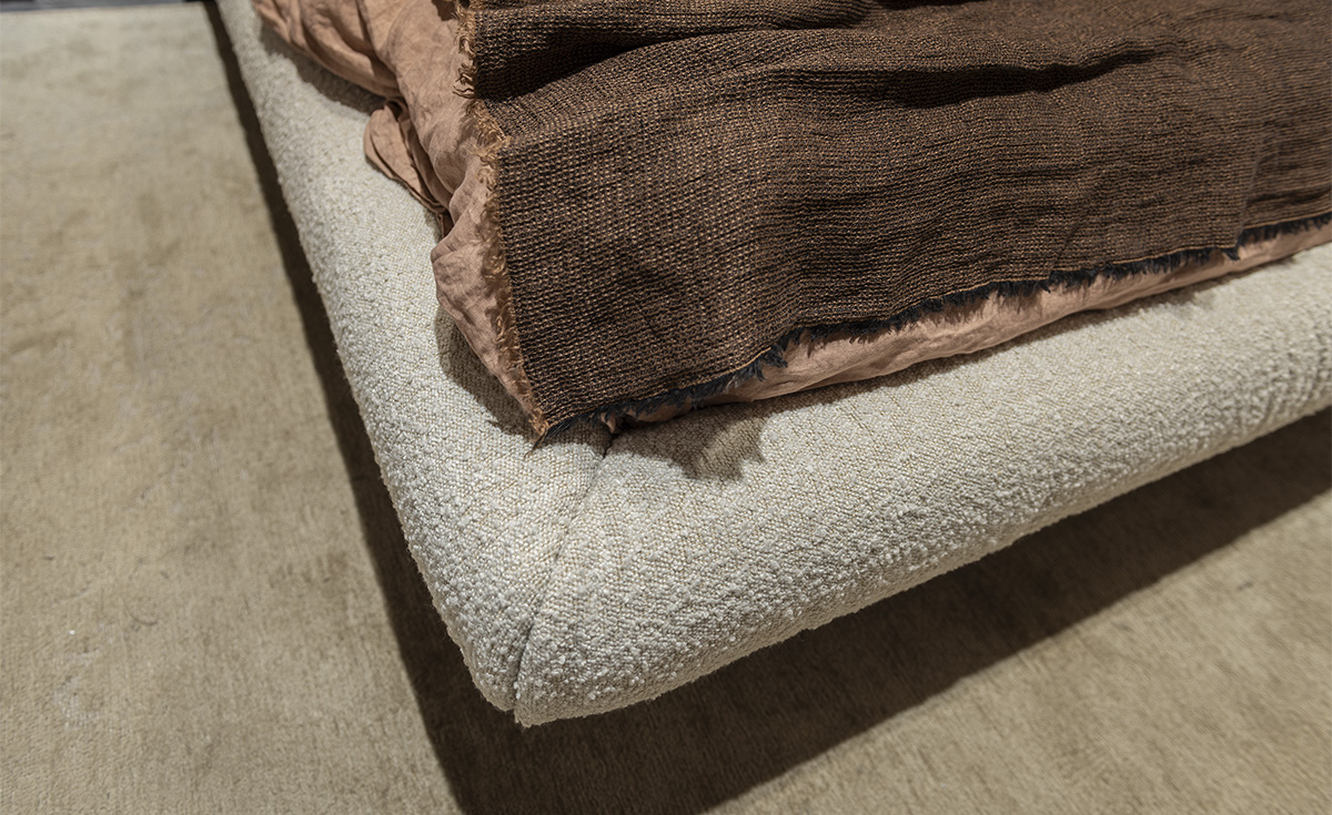 Upholstered bed covered in fabric, micro nubuck, synthetic leather or soft leather as per sample card. Canaletto walnut (FrNC) or burned oak (FrRB) stained ashwood feet. Slats included. Mix version M: "A" in fabric or micro nubuck. “B” in synthetic leather or soft leather with soft leather belt as per sample card.