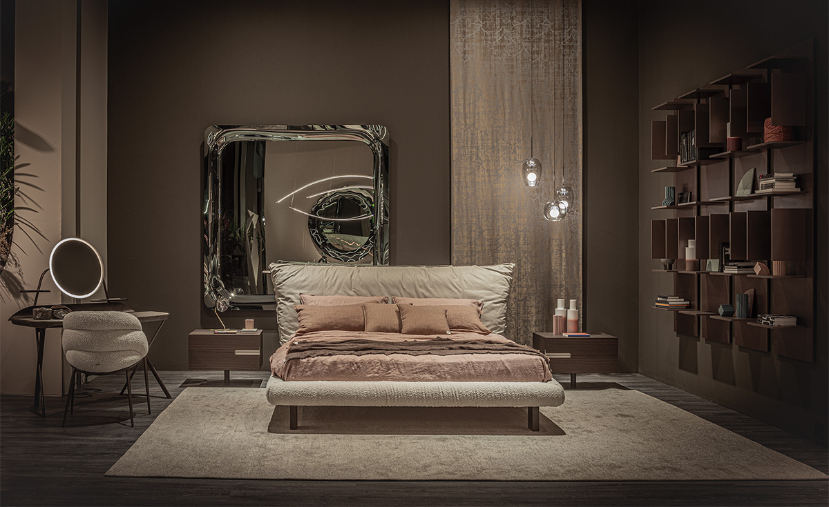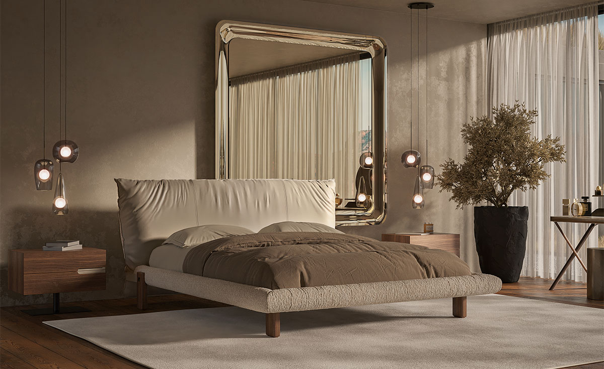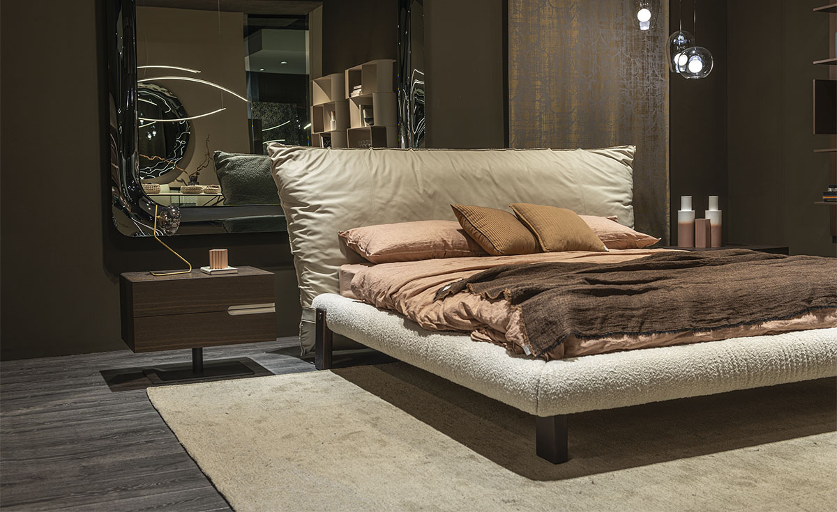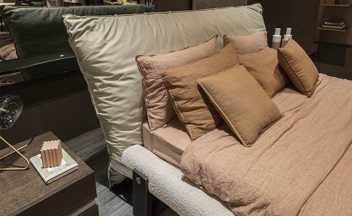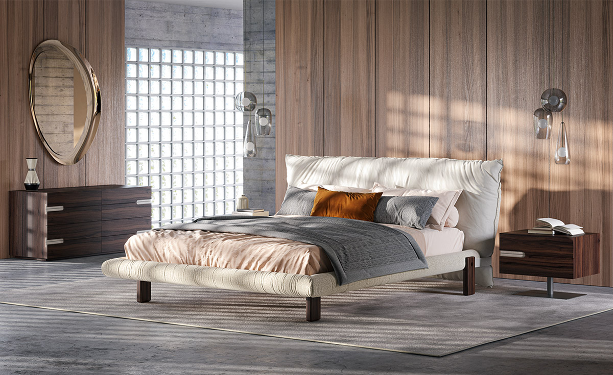 The Pascal designer double bed owes its imposing stage presence to its large headboard, made up of a single large bolster, designed for relaxing moments before falling asleep, with your back gently resting on its soft upholstery. The headboard can be finished in a wide choice of leathers and fabrics, either all in one or combining different materials on the front and back, to play with different colour tones.