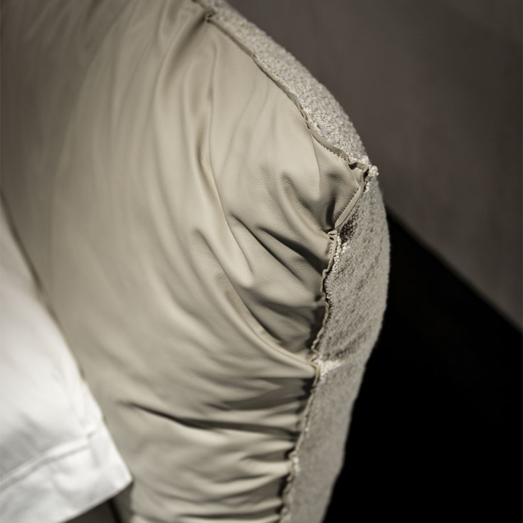The most original detail on this modern double bed is the leather straps that join the headboard to the bed frame, accentuating the pillow recesses in the sides and creating soft folds that infuse a sense of wellbeing and comfort from the very first glance.