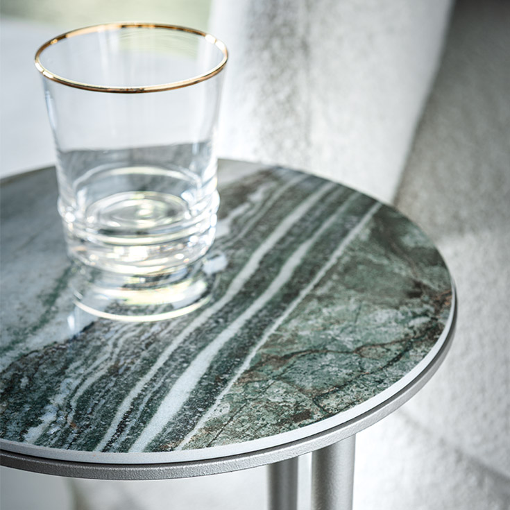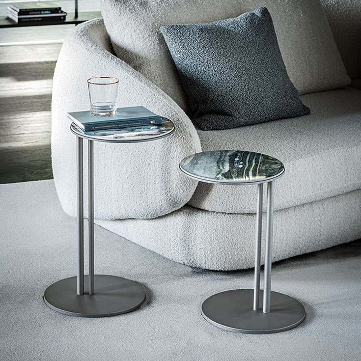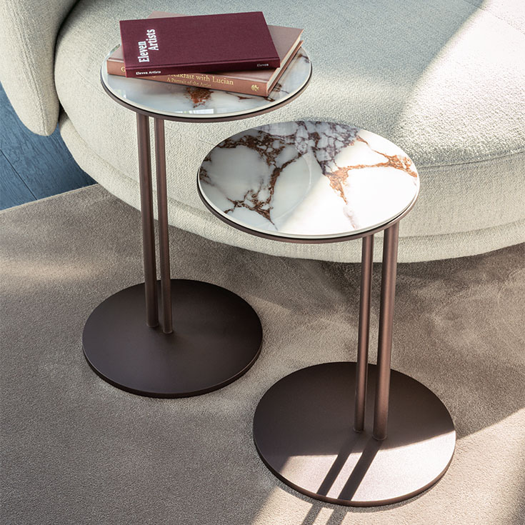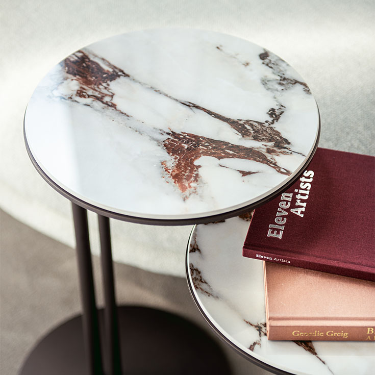 The iconic Sting coffee tables captivate us once again in the new Sting XL version, where the top becomes larger to provide a practical and stable surface. Paolo Cattelan's design reaches its full expression, making the ceramic Marmi top finish the protagonist, offering natural and sophisticated elegance. These lightweight, manoeuvrable metal tables pair effortlessly with sofas and armchairs. Perfect for placing devices, magazines, or offering an aperitif to guests. They make your modern living room inviting and versatile. The steel base of our design tables consists of two slender legs of different diameters, enriched with exquisite hand crafted finishes.