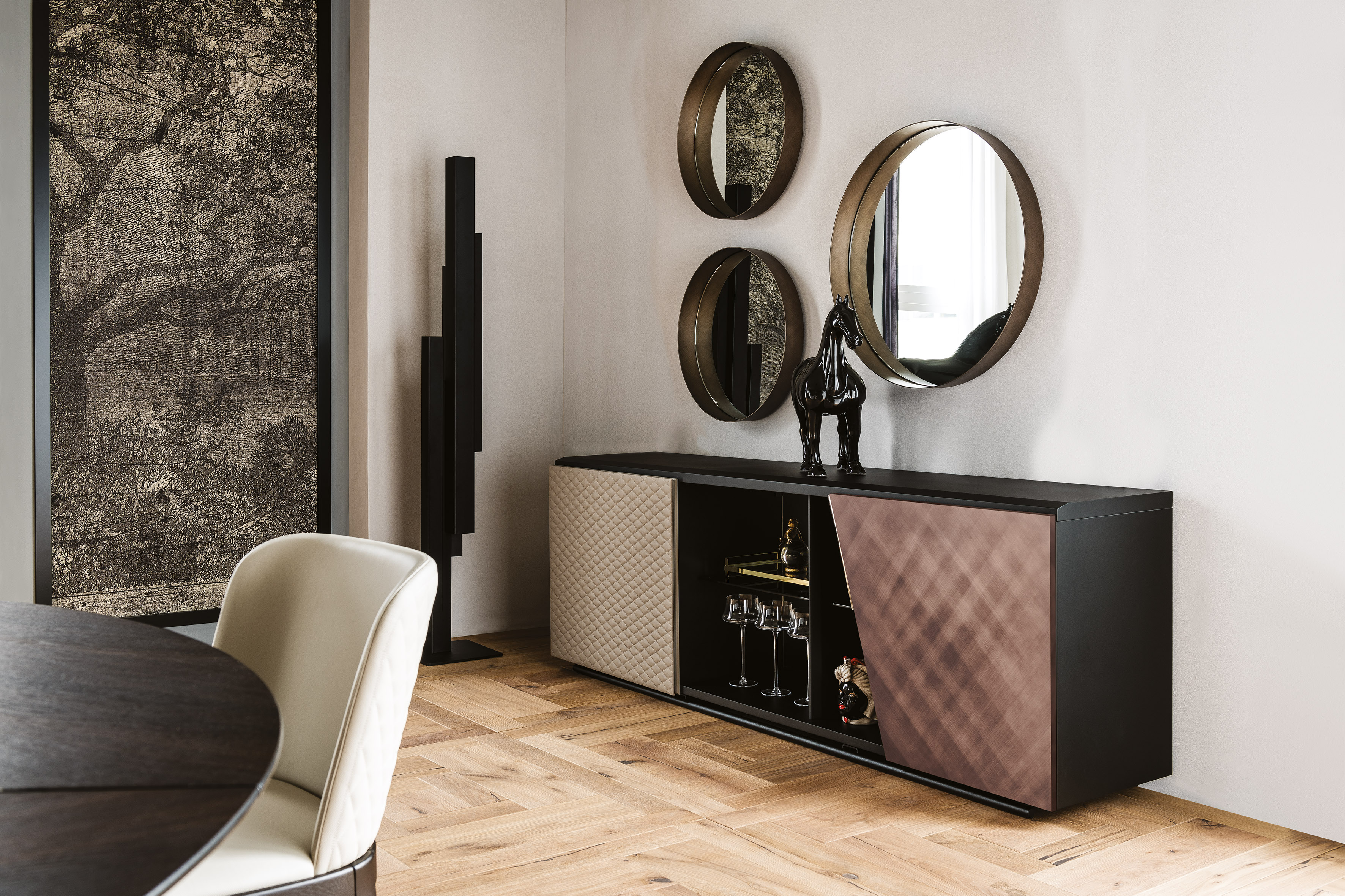 Sideboard in lacquered black (GF73) embossed wood. Black (GFM73) embossed steel base. Left door covered and quilted in synthetic leather or soft leather as per sample card with embossed titanium (GFM11) aluminum profiles. Central section with mirror. Right door in Brushed Bronze with black chrome (06) details. Internal fumé glass shelves. Colour and brushing variations of the Brushed finish are characteristics of the handcrafted processing and should not be considered as defects.