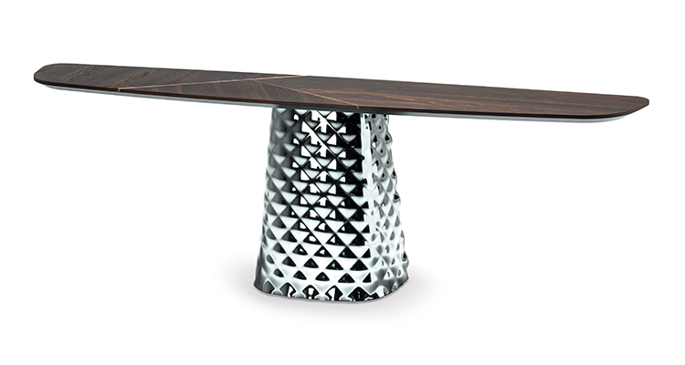The base of the attractive and practical Atrium console consists of two finely worked plates of couture mirrored glass. It creates a play of soft reflections, in which the surrounding objects and light sources reverberate. The glass is shaped with an unprecedented technique that gives the surface a three-dimensional effect like quilting on fabric.