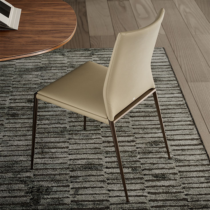 Chair with steel structure in chromed (08), titanium (GFM11), bronze (GFM18) or black (GFM73) finish. Cover in fabric, micro nubuck, soft leather or synthetic leather as per sample card. The cover is not removable.