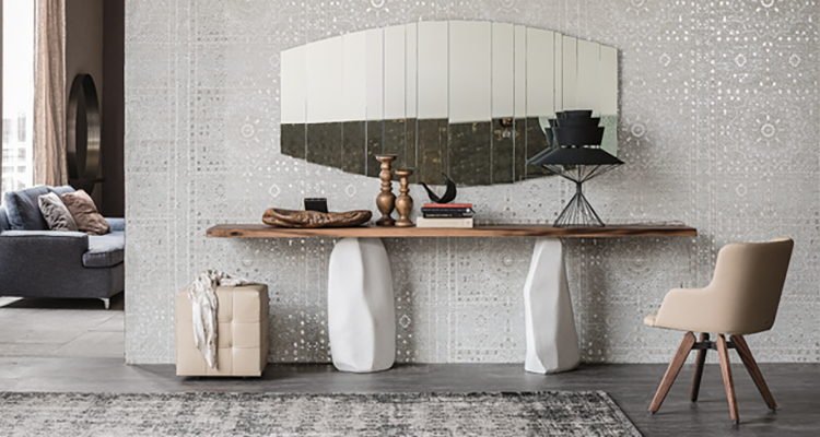 The wooden console table Rapa Nui is an elegant combination of naturalistic inspiration and excellent production techniques. The top in fine solid wood seems to rest precariously on the irregular base, formed by two monoliths. The irregular edges of this modern console make it agreeable to the touch and give it a more natural look.