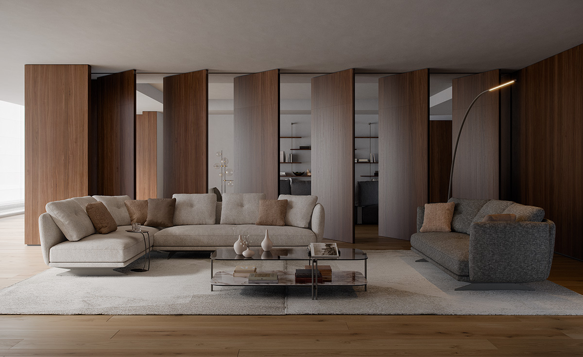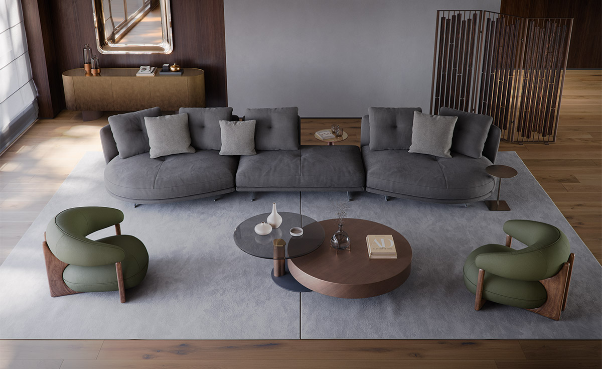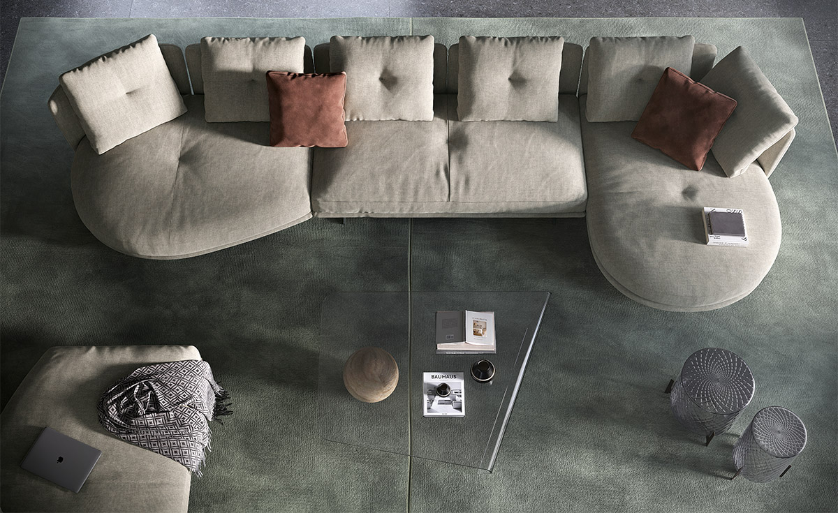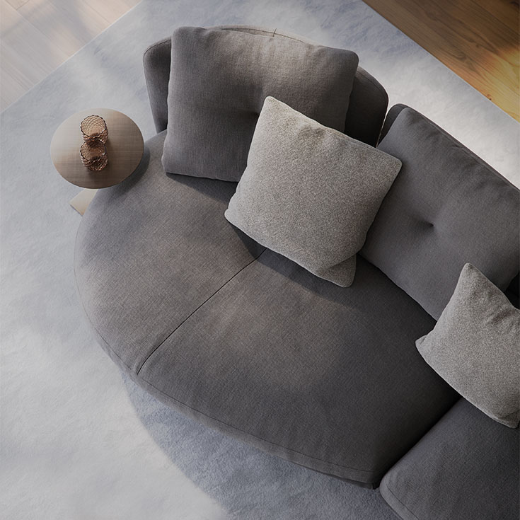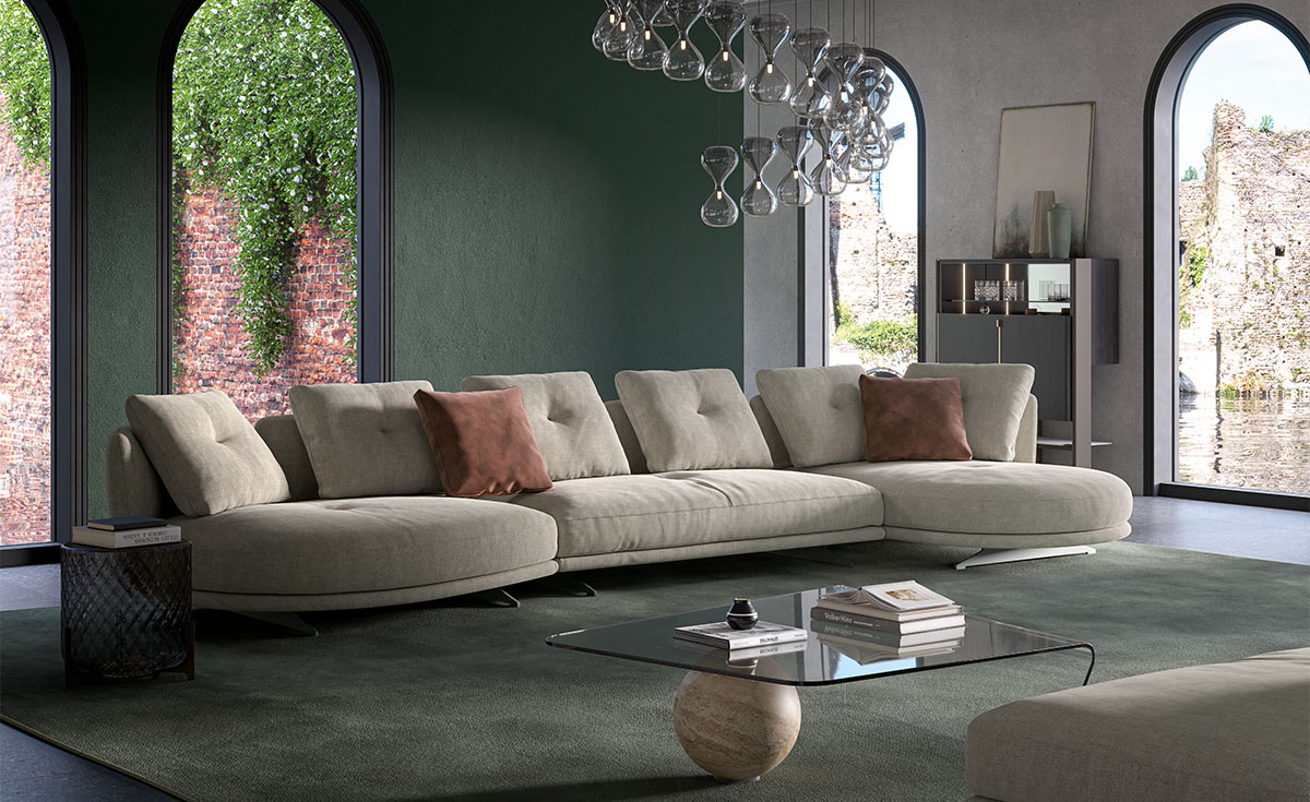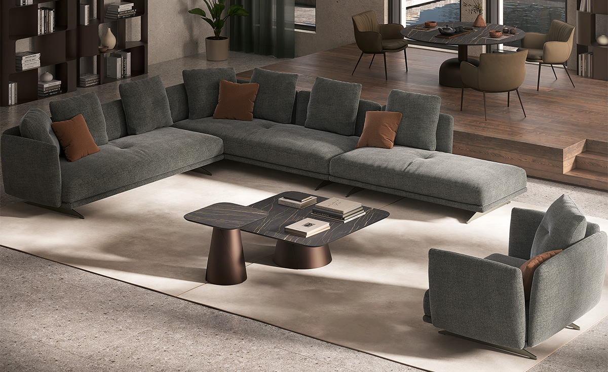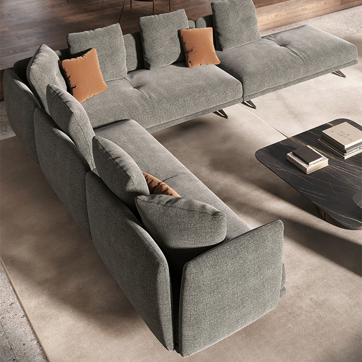 An expression of interior design, the Douglas modular sofa encompasses the harmony of a warm welcome and fine design, blending seamlessly into your home environment. Express your artistic flair to the full thanks to the wide range of modules: choose the linear configurations, ideal for a central room placement, or corner configurations, designed for moments of conviviality and relaxation. Removable and reversible armrests and backrests make it possible for you to easily renew your design living room or the look of your exhibition space. The compositional versatility of the Douglas modern sofa provides solutions with a chaise longue or elegant rounded peninsulas, for a true oasis of peace. The clean, linear structure forms a pleasant contrast to the sinuous curves of the practical cushions with removable covers, upholstered in a feather blend. The seating, enhanced with an innovative polyurethane microfibre, guarantees lasting firmness and comfort, making the Douglas a comfortable and luxurious sofa.