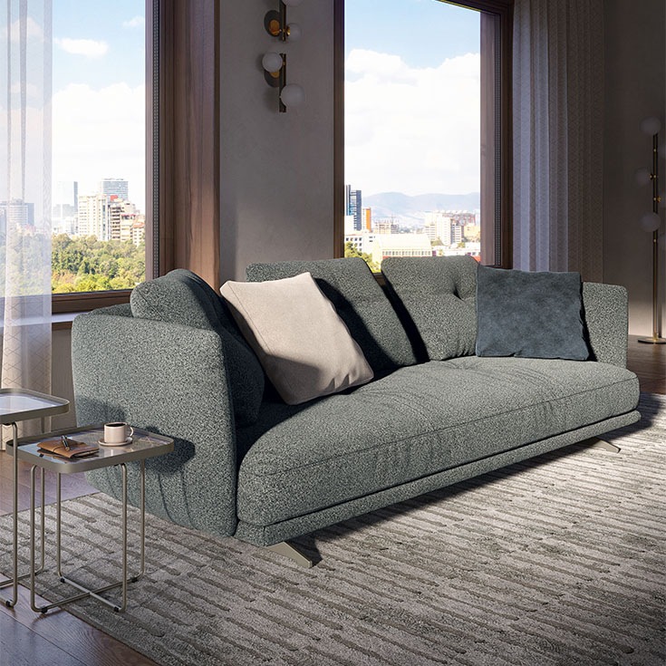 Sofa or modular sofa with wooden frame, polyurethane and polyester fiber padding. Feet in titanium (GFM11), bronze (GFM18) or black (GFM73) embossed lacquered metal, available in two heights. Feather filled backrest cushions. Cover in leather or fabric as per sample card. Removable cover only in the fabric version.