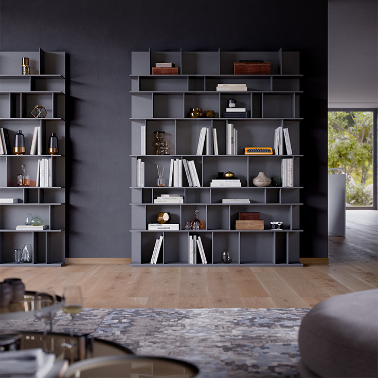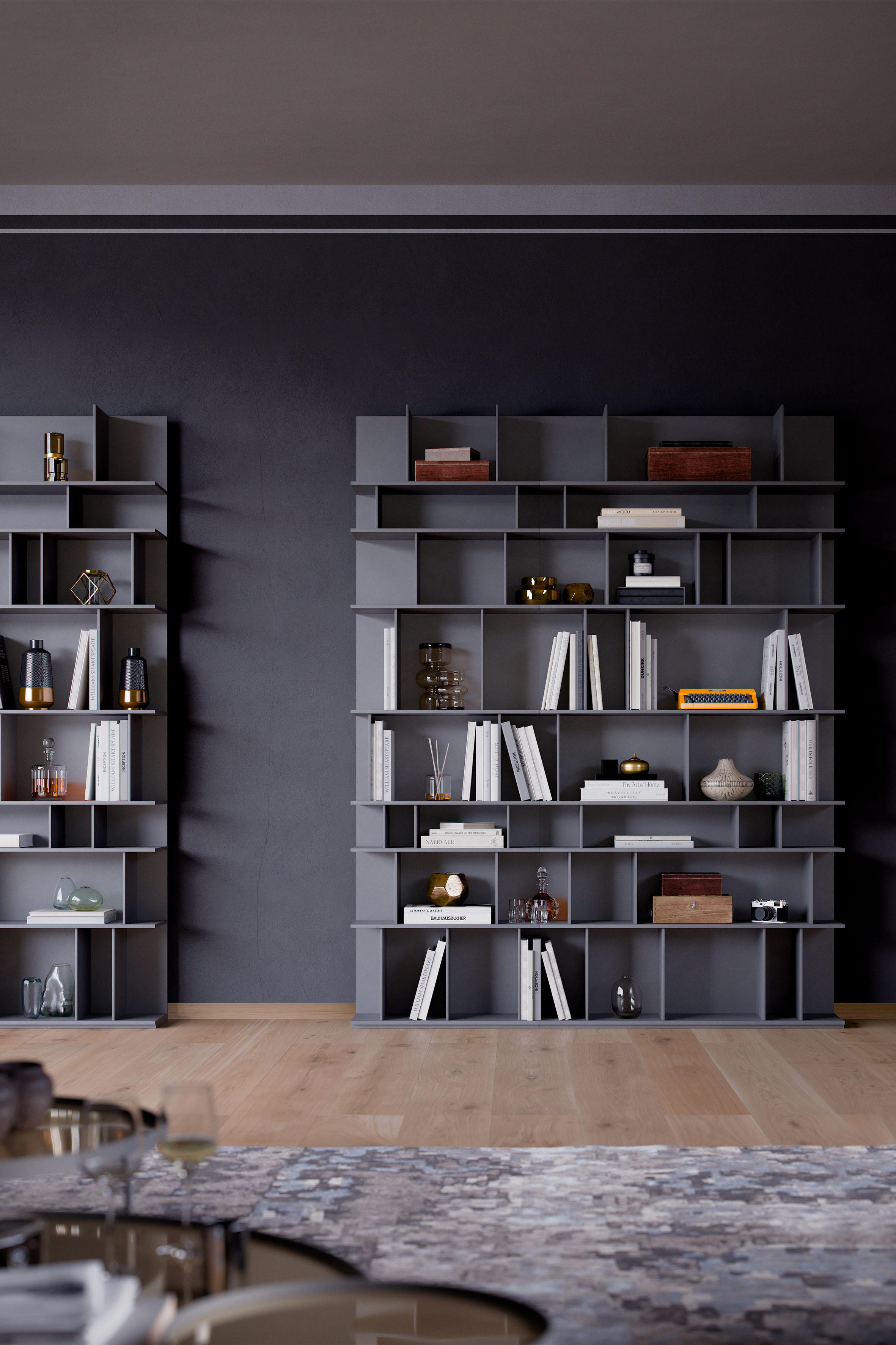 Modular bookcase in titanium (GF11), graphite (GF69) or white (GF71) lacquered embossed MDF. Max capacity: kg 60 (105), kg 45 (65), kg 40 (B) spread load. Wall anchorage is necessary.