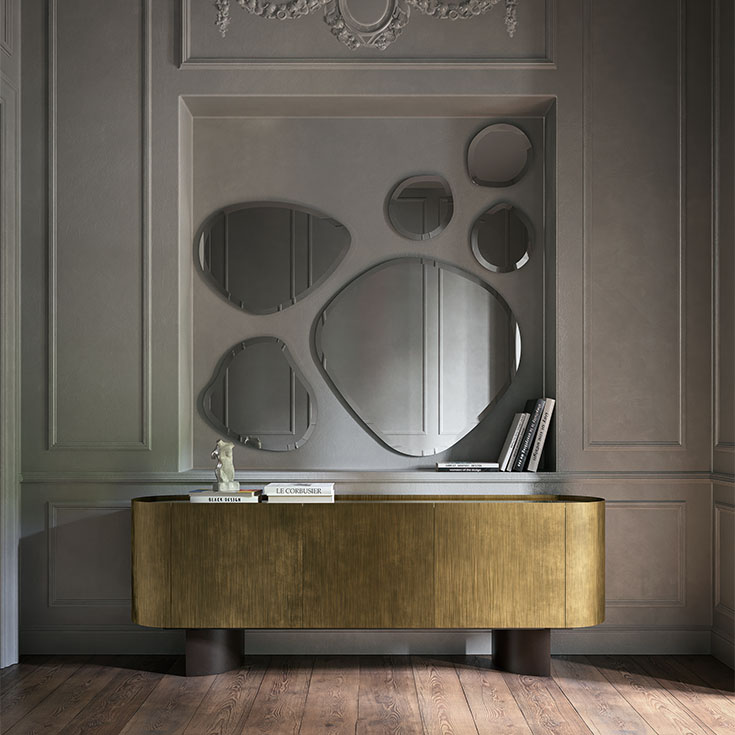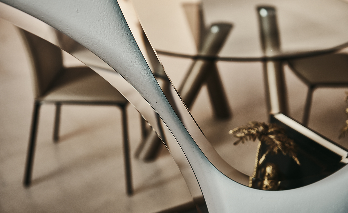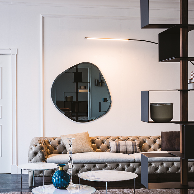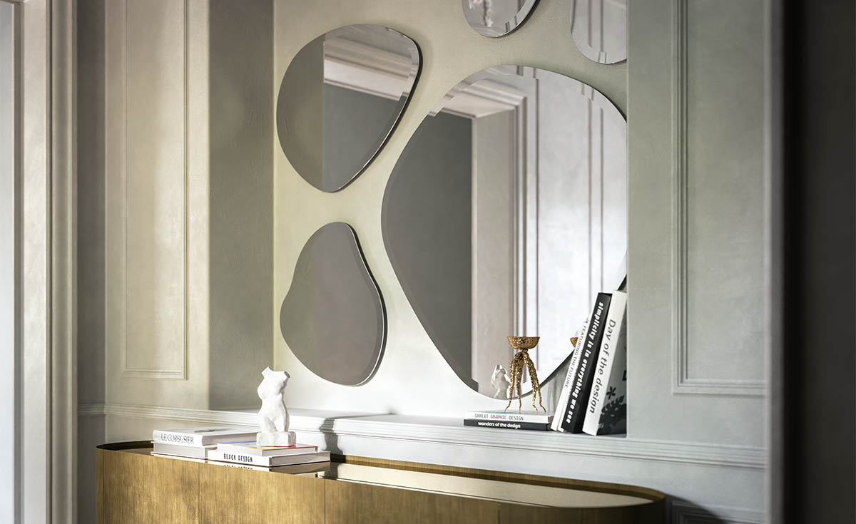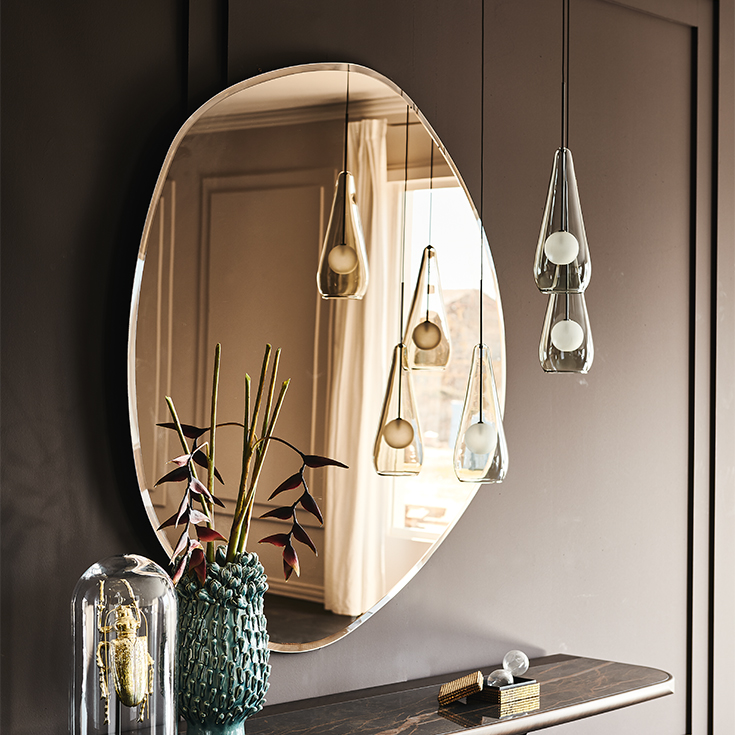 Five modern wall mirrors like the five main islands of the paradise archipelago of Hawaii. Take a moment, imagine your wall decorated with the irregular shapes of the Hawaii mirrors reminiscent of pristine nature: what composition do you see? The delicacy of the bevelled shapes is combined with the excellent quality of the mirrored glass to create a fascinating and exotic decoration. The mirrored edge is worked to achieve an interrupted reflection, thus creating a well-defined but discreet and delicate frame. This family of modern mirrors is complemented by two larger versions: the irregularly shaped Hawaii Magnum mirror, and the Hawaii Round mirror.