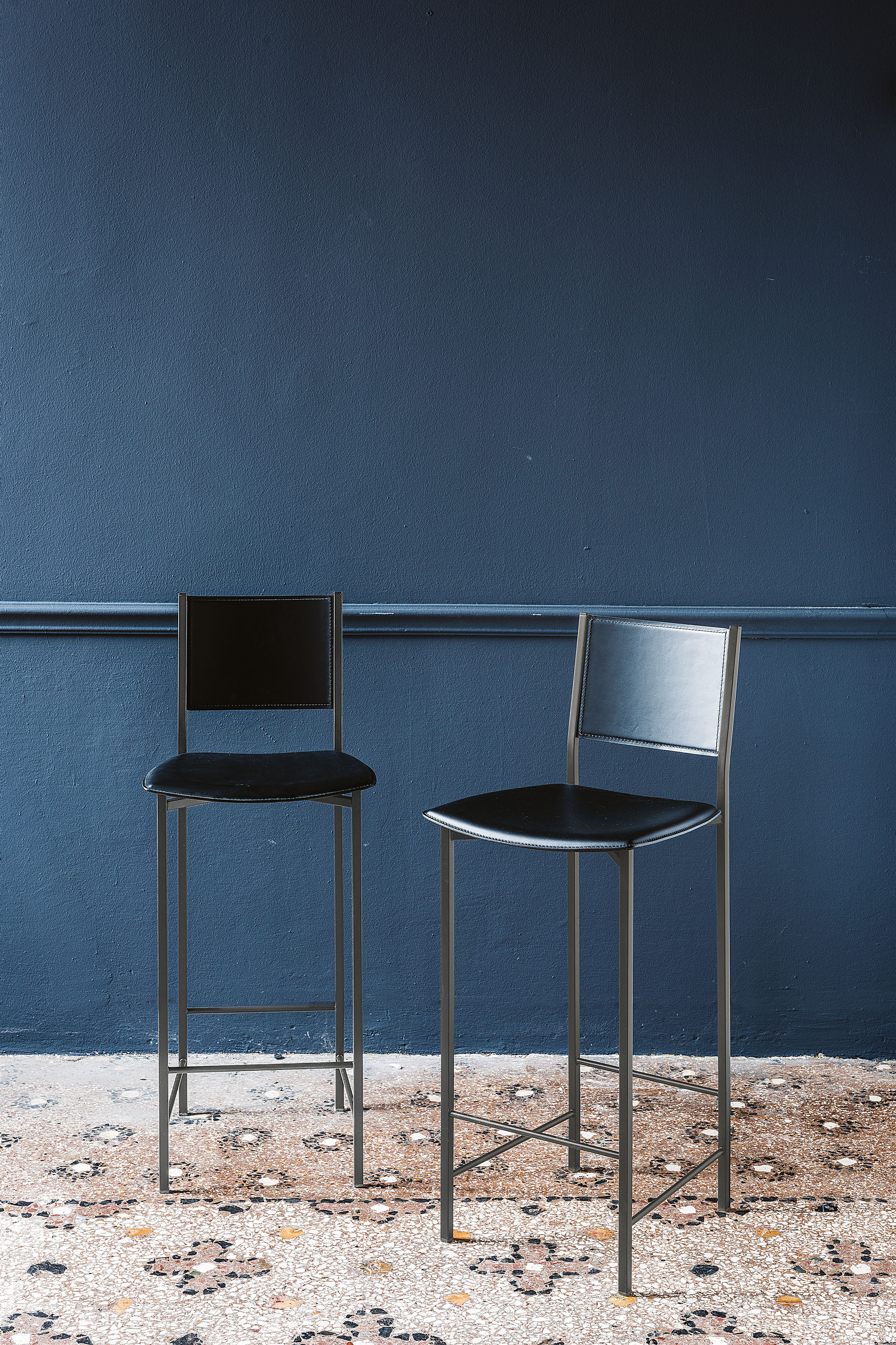 Stool with frame in black (OP17) or graphite (OP69) painted or titanium (GFM11) embossed lacquered steel. Back and seat in leather as per sample card. Standard stitching.