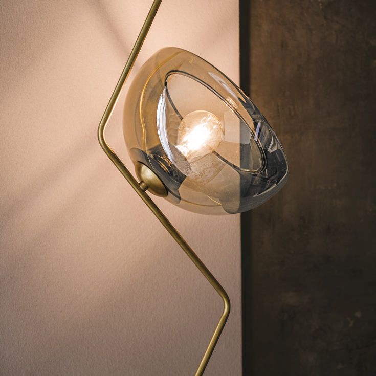 The floor suspension lamp Tramonto has the charm of a minimalist, subtle accessory. A simple but captivating brass stem supports a half-sphere lampshade with a retro touch. The smoked crystal allows the light to be diffused softly.This modern floor lamp is designed to create a refined atmosphere in a modern design living room or in the most intimate rooms of the house.