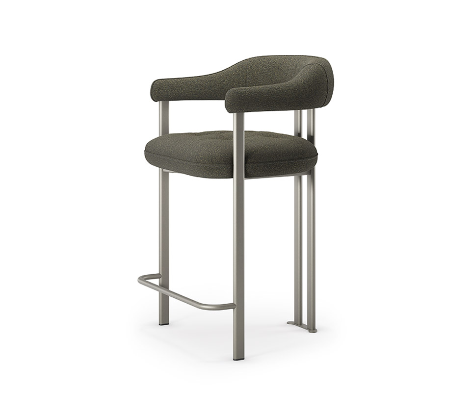 The Greta family of armchairs is completed with the new kitchen counter stool, a versatile piece designed for living spaces, both in residential projects and contract design. Greta is a stool with a backrest: a soft and comfortable support, composed of a shaped and curved cylinder that wraps around the back, and opens into the comfortable padded armrests. The seat cushion of this design stool is spacious and comfortable, enhanced with capitonné stitching, soft and refined. The rear structure of this modern stool, composed of two closely spaced legs, defines a central space; a play of solids and voids that continues between the seat and backrest. The result is a harmonious design, capable of conveying a sense of lightness and balance.