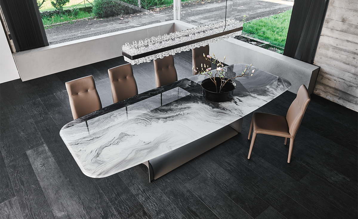 The Dragon dining tables family is composed by different models depending on the top material. Several combinations between top and edges allow these design tables to meet many styles and to furnish a modern dining room.