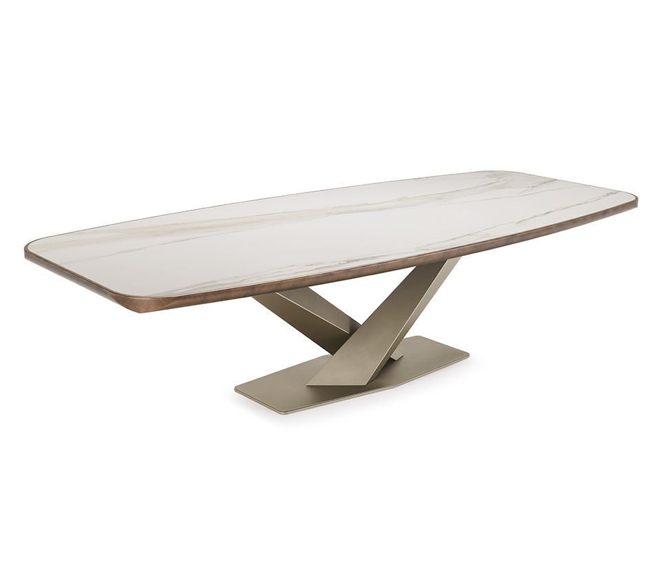 Table with base in titanium (GFM11), bronze (GFM18), graphite (GFM69) or black (GFM73) embossed lacquered steel. Top in ceramic Marmi Alabastro (KM02), matt Golden Calacatta (KM05), glossy Golden Calacatta (KM06), matt Portoro (KM07), glossy Portoro (KM08), glossy Sahara Noir (KM09), Makalu (KM11), Breccia (KM12), Borghini Calacatta opaco (KM18), Borghini Calacatta lucido (KM19), Colosseo (KM21), Andromeda (KM22), matt Invisible (KM24) or Luxor (KS23) with Brushed Bronze or Brushed Grey lacquered and rounded lower profile. 6cm thick top on 300x128 version and 5cm on 200x120 and 240x120 versions. Colour and brushing variations of the Brushed finish are characteristics of the handcrafted processing and should not be considered as defects.