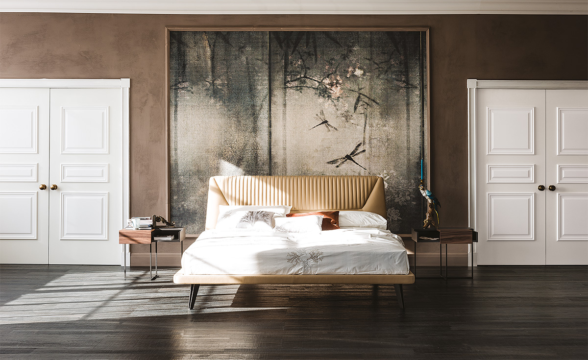 Upholstered bed covered in synthetic leather or soft leather as per sample card. Bronze (GFM18) or graphite (GFM69) embossed lacquered steel feet. Back headboard covered in synthetic leather, optional back headboard covered in soft leather. Provided slats are part of the bed structure.