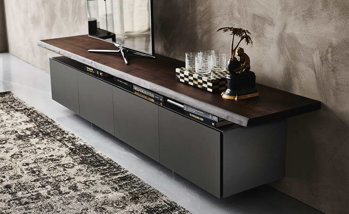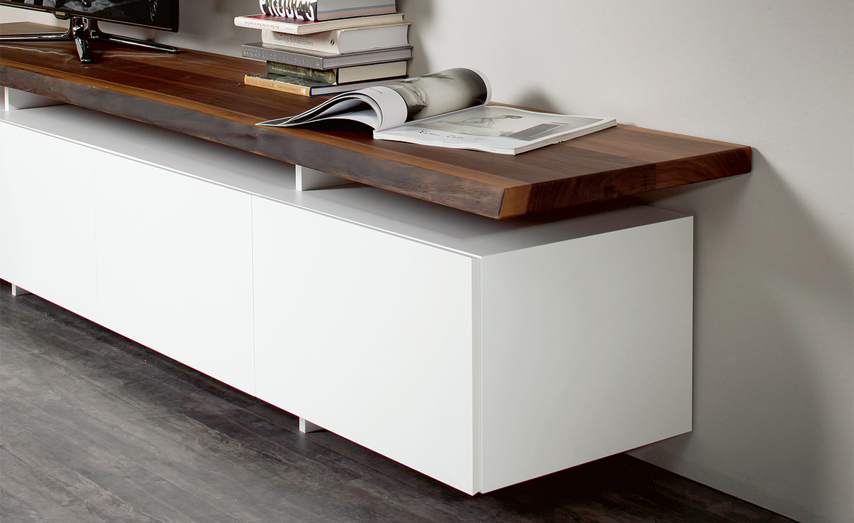 TV cabinet with 3 or 4 wooden doors painted in matt white (OP7) or graphite (OP69). Top in the same color of the frame or in solid Canaletto walnut (NC), burned oak (RB) or natural oak (RN) with irregular edges.