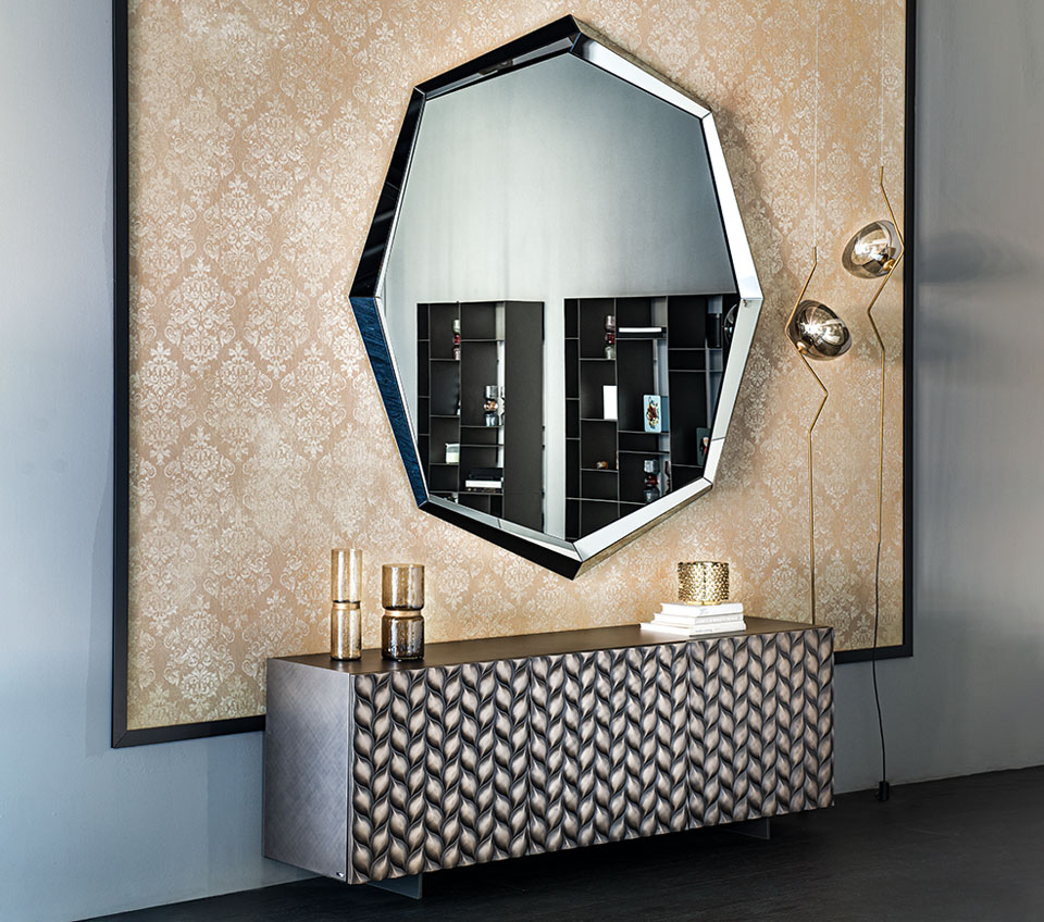 Emerald is a family of designer mirrors with a fully mirrored frame. With their sharp-cornered shape and three-dimensional frame, these mirrors are like precious stones, and as such, they reflect different views of the surrounding room. The large Emerald contemporary wall mirror is designed to decorate a wall while simultaneously expanding the room. Emerald is available in round or rectangular shapes or in the 2-metre-large Emerald Magnum version. To give the room a more intimate and sophisticated effect, Emerald can have a fumé glass mirror.