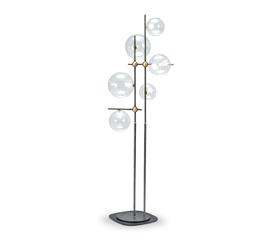 Bloom is a modern chandelier composed of thin metallic branches that "bloom" into six large transparent crystal spheres, shining like ripe fruit in the sunlight. The joints and ends of the branches, essential technical details, are enhanced with a brushed brass finish, making them decorative elements. The connectors come in different sizes, designed to balance the composition of weights and volumes. The distinctive feature of this pendant lamp lies in its mutable soul: it is possible to combine multiple chandeliers to create a repeated modular effect. Bloom can also be interpreted in the floor lamp version, characterized by a slim and elegant stem that branches out into space, creating a three-dimensional effect. Where there is light, there is life: thus, even a floor lamp becomes an image of a plant sprouting, with the lampshades resembling the foliage.