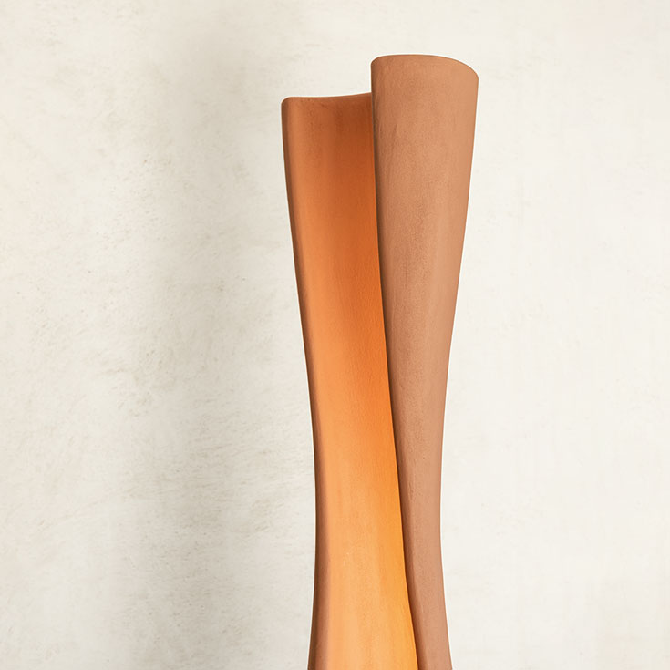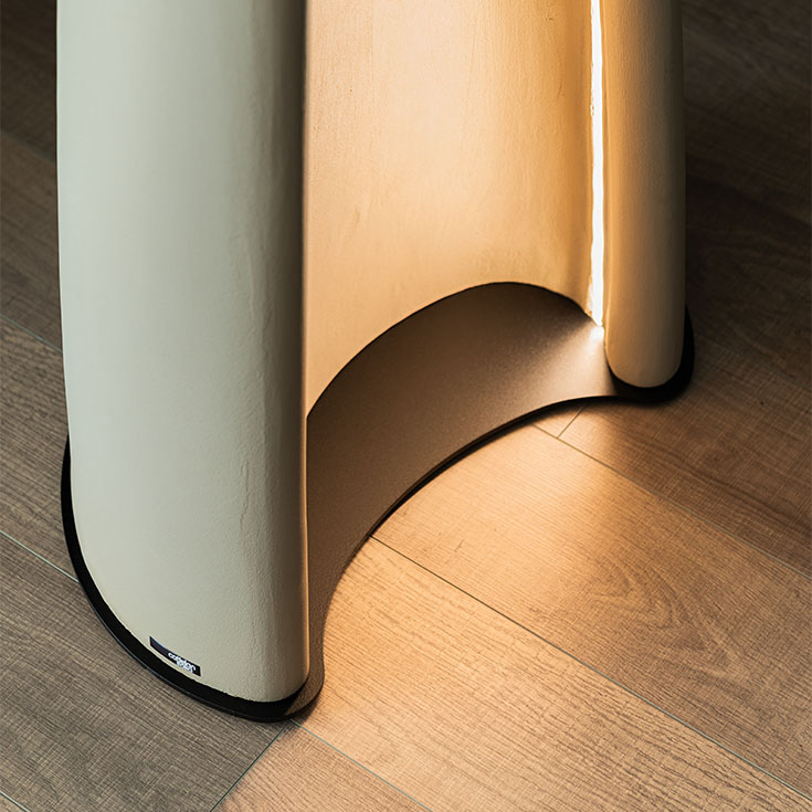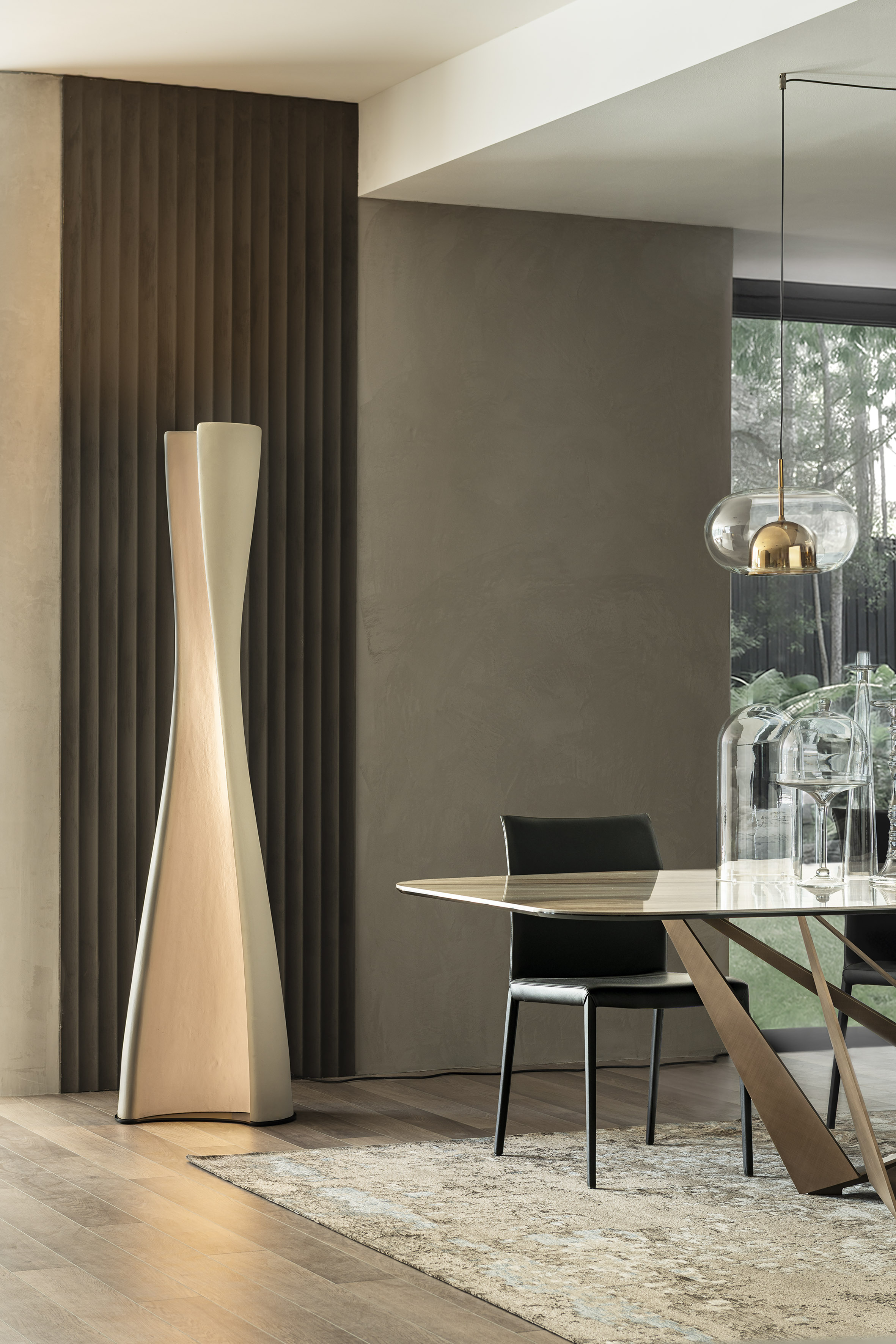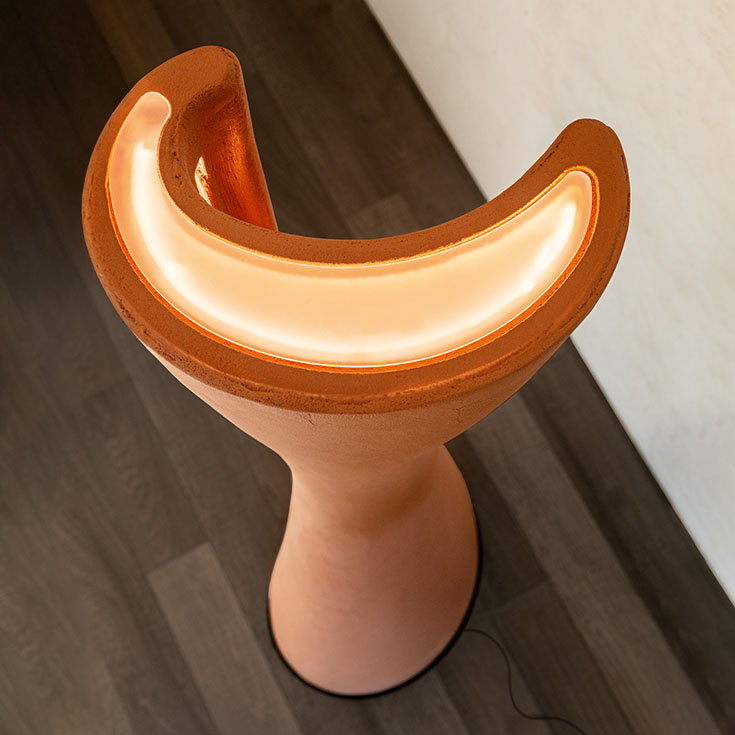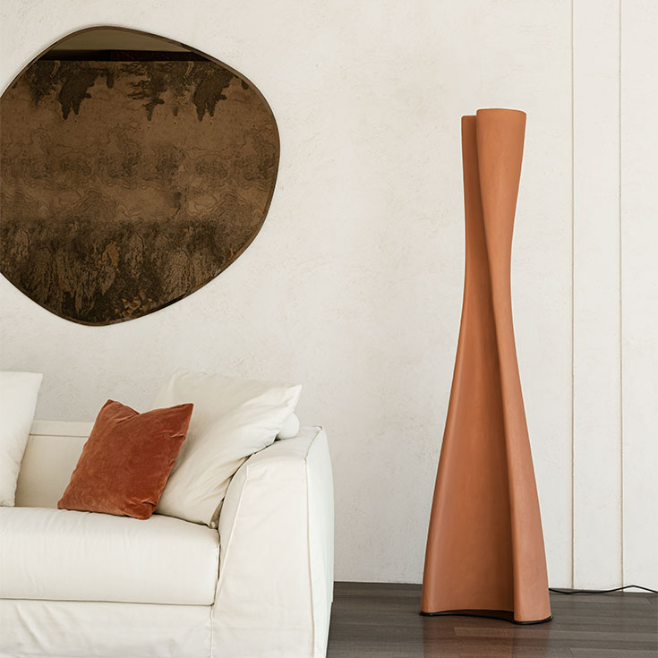 When interior design meets sculpture, Diploma is born a floor lamp with a powerful visual impact that transforms your contemporary living space into a true art gallery. The warm and soft light, perfect for relaxation in a lounge area, comes from a LED strip embedded within the silhouette, emphasizing the material aspect of the clay finish. Each piece is unique: every floor lamp is manually finished, bearing all the precious imperfections inherent in this material. Its sinuous structure evolves from the golden ratio yet follows the free-flowing impulse of curved lines, resembling a rolled parchment. Thus, Diploma becomes the emblem of what is meant to endure over time—a designer floor lamp suitable for any environment, from modern living rooms to classic spaces.