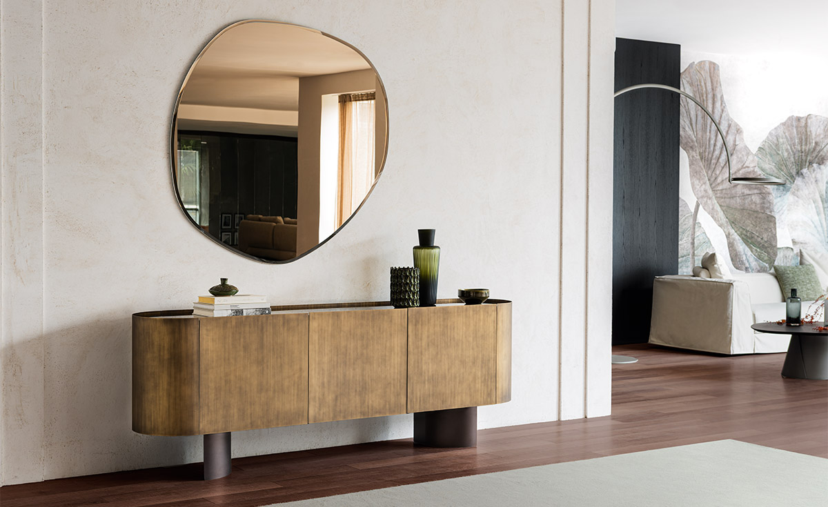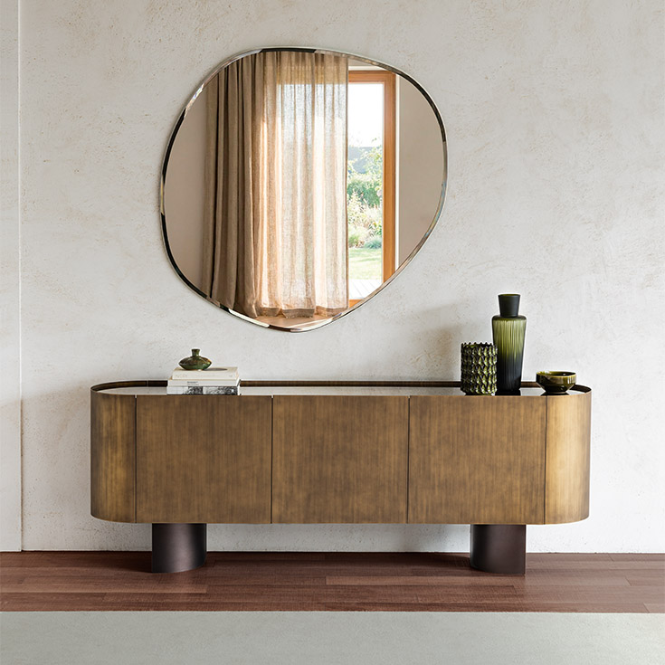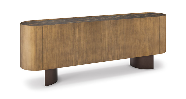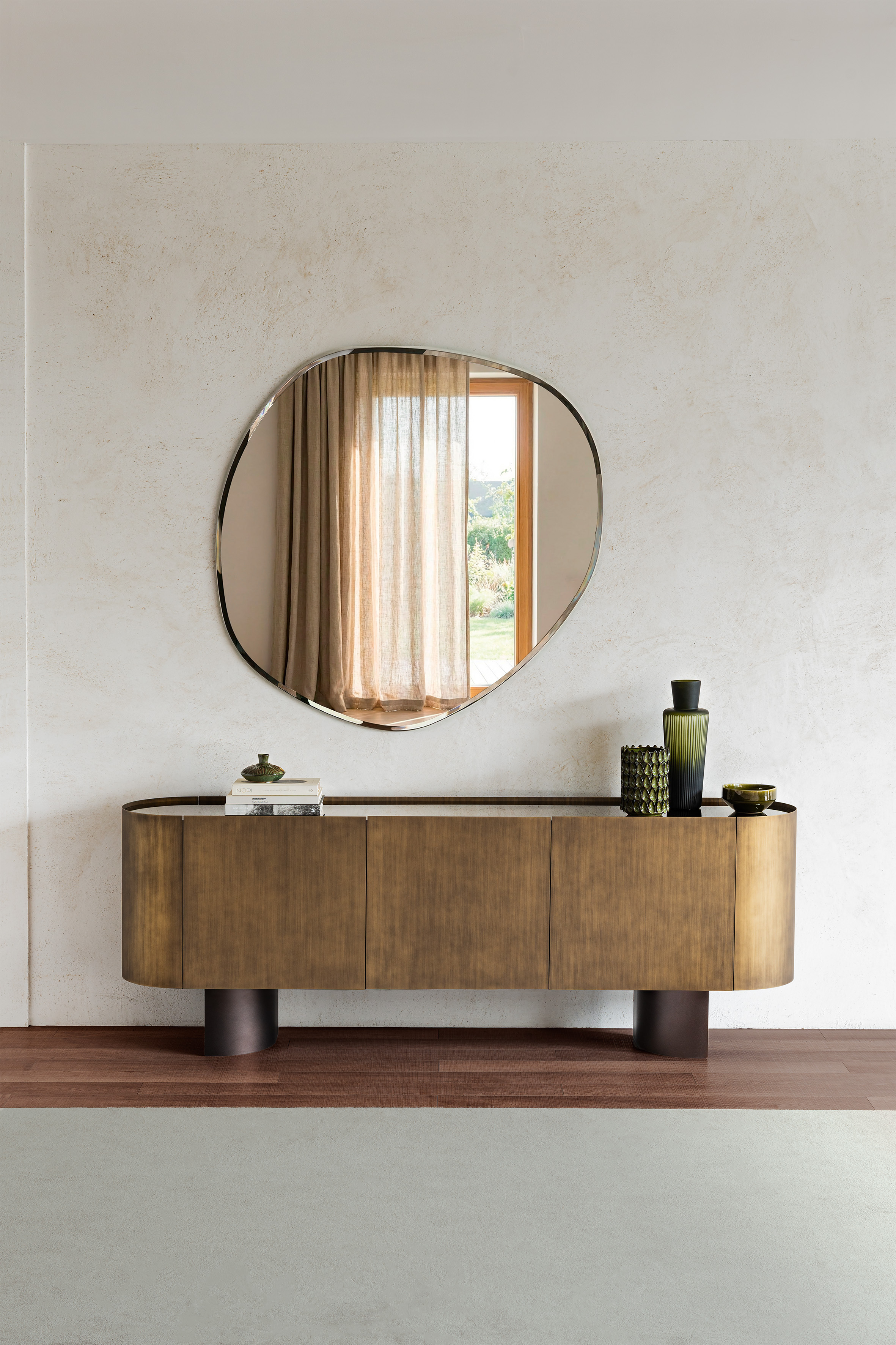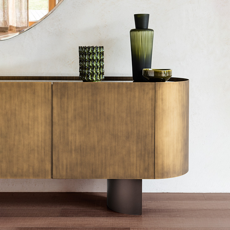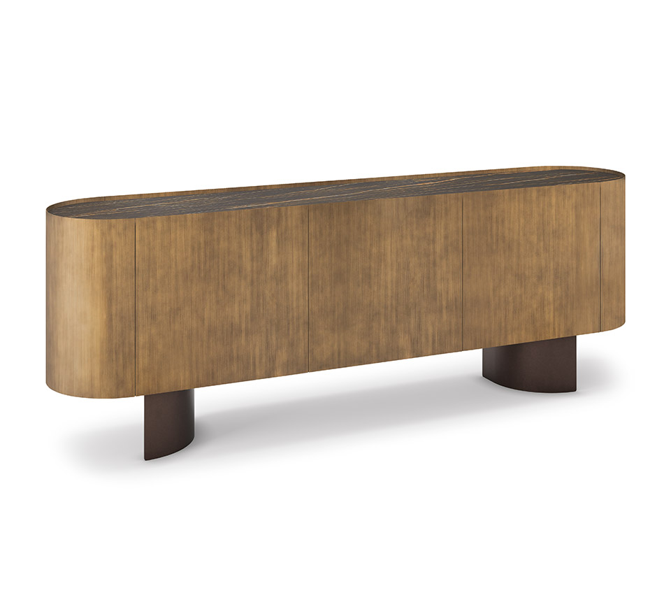 Sideboard with wood frame covered in bronze (GFM18) or Oxybrass embossed lacquered steel. Top in bronze mirrored glass or in ceramic Marmi matt Golden Calacatta (KM05), glossy Golden Calacatta (KM06), matt Portoro (KM07), glossy Portoro (KM08), Breccia (KM12), Colosseo (KM21) or Taj Mahal (KM26). Feet in bronze (GFM18) embossed painted steel. Internal shelves.