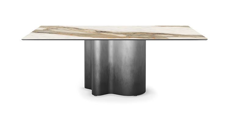 Its sinuous base has been cleverly designed to change in appearance depending on the position from which it is viewed. Full and empty cylinders swap places with the changing light and shadow when viewing this designer table from different angles. This makes Papel models both slender and imposing at the same time, especially if you choose to enhance the base with a finish from the Brushed range: hand-brushed by skilled craftsmen. The curved metal base is made in one piece, adding to the quality of this modern dining table.