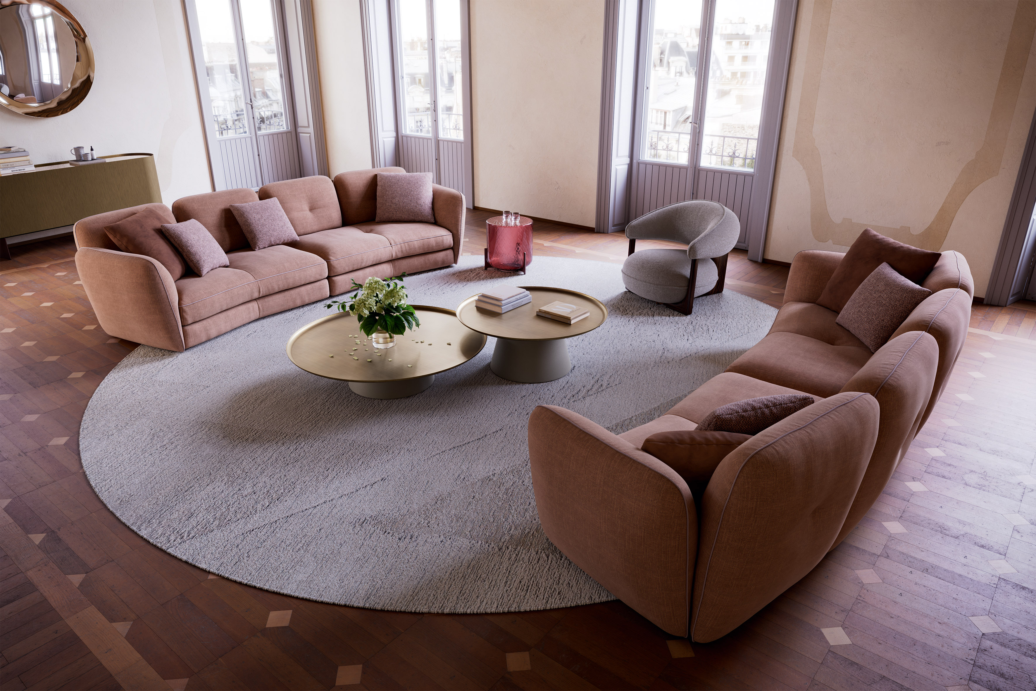 Michael is not just a designer sofa; it is a unique experience that brings the warmth of a familiar landscape to your modern living room. Its charm is expressed through the enveloping seat of the semi-circular module —an elegant "amphitheatre" ideal for shared moments and perfect as a centrepiece in any space. With Michael, you can furnish any setting: the gently curved, upholstered cushions reduce depth, making it easy to place in more compact residential spaces and lounge areas. Also suitable for contract settings, this modern sofa showcases exquisite tailoring details, such as the soft stitching on the backrest and the refined grosgrain piping. When your well-being is our priority, a modular sofa’s flexibility is essential. Choose the perfect configuration by pairing practical footrest poufs with open backrests elements, thoughtfully designed to complement our modern coffee tables.