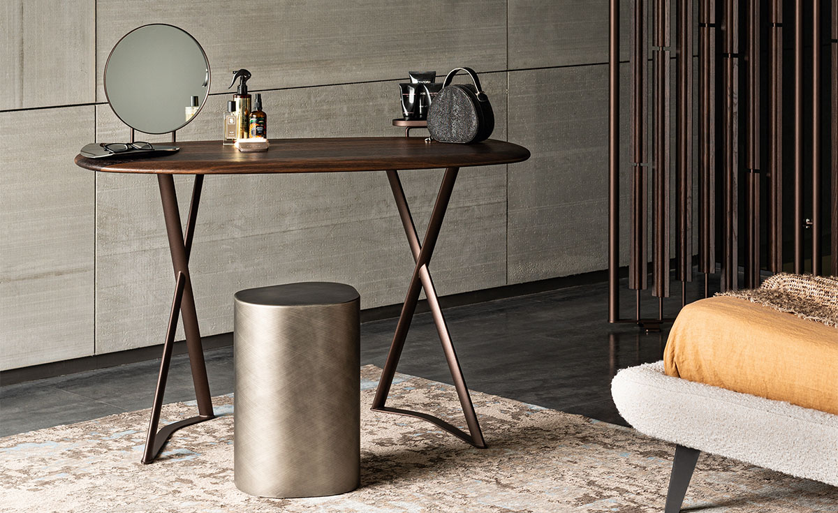 Dressing desk with base in titanium (GFM11) or bronze (GFM18) embossed lacquered steel. Top with rounded edges (U) in Canaletto walnut (NC) or burned oak (RB). Accessory tray and mirror with frame in titanium (GFM11) or bronze (GFM18) embossed lacquered steel. Mirror and tray can be assembled in three different positions.