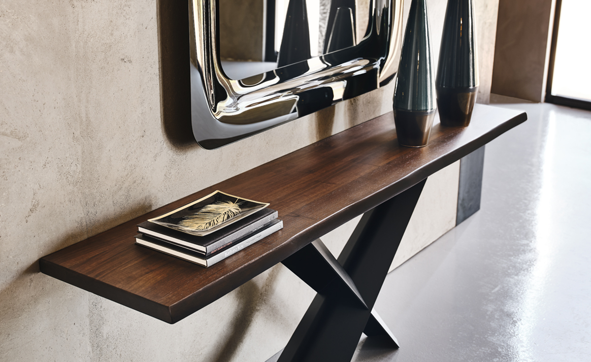 Console with base in titanium (GFM11), bronze (GFM18), graphite (GFM69), pearl (GFM70) or black (GFM73) embossed lacquered steel, Brushed Bronze or Brushed Grey. Top in Canaletto walnut (NC), burned oak (RB) or natural oak (RN) with solid wood irregular edges. Wall anchorage is necessary.