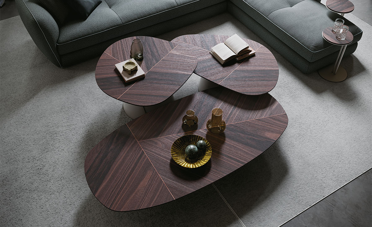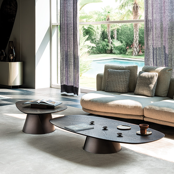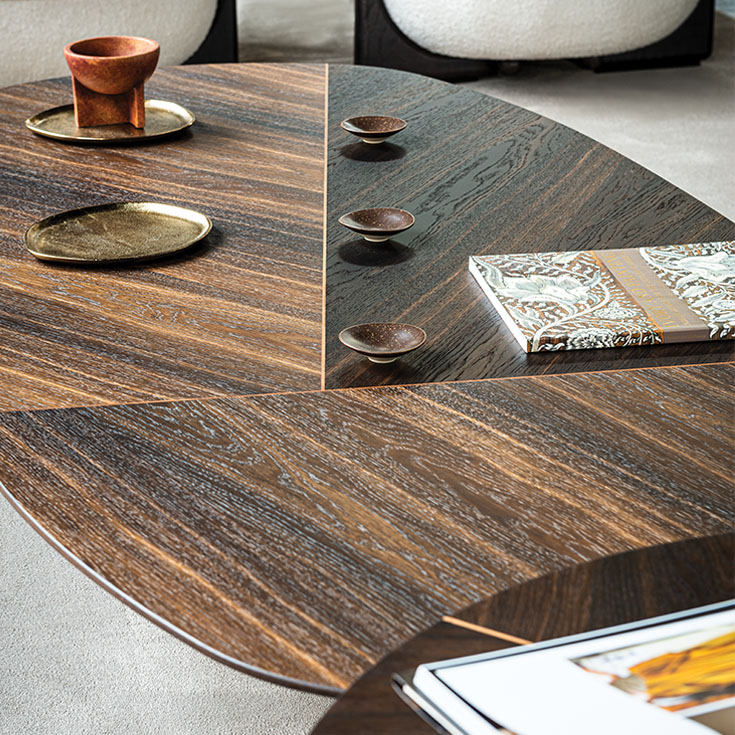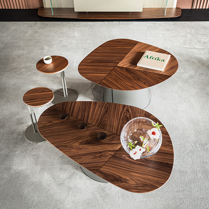 Featuring identical bases and tops with soft, irregular geometries, these designer coffee tables achieve their highest aesthetic expression when arranged in compositions of varying heights and sizes. The interplay of multi-level surfaces brings dynamism to a space furnished with understated elegance, where the modern wooden coffee tables take centre stage.