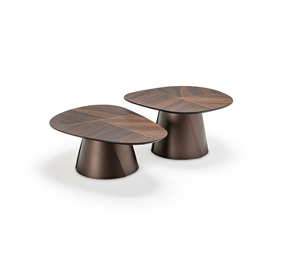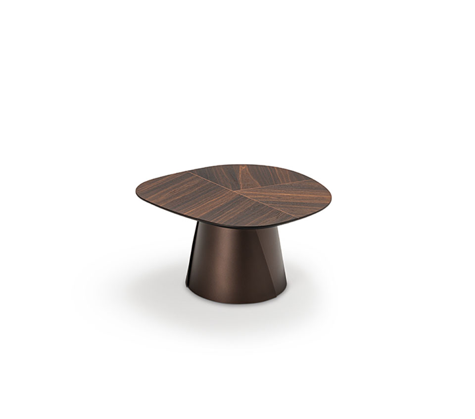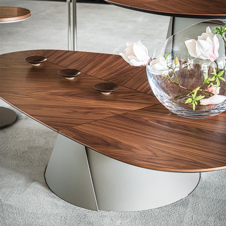 Coffee table with base in titanium (GFM11) or bronze (GFM18) embossed lacquered steel. Top with belleved edges in Canaletto walnut (NC) with details in burned oak or burned oak (RB) with details in Canaletto walnut.