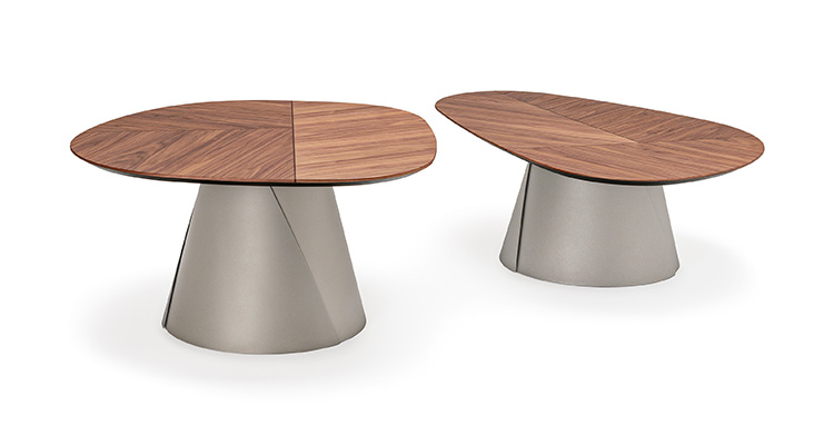 The conical metal base is proportioned to the size of the tabletop. Made from two rolled and overlapped steel sheets, it has a slender silhouette shaped by two diagonal cuts in the metal.