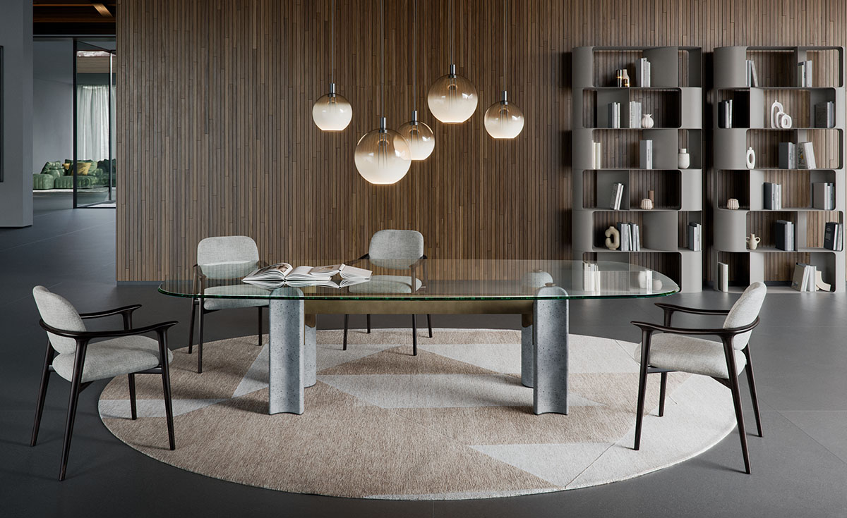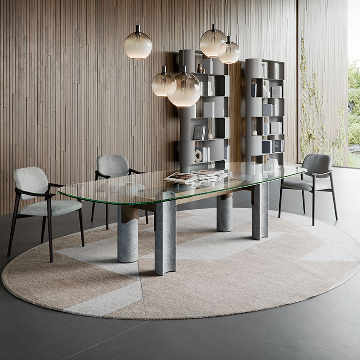 Bilbao responds to the pursuit of sustainable interior design: it is derived from a cold moulding technique, which ensures complete recyclability and low environmental impact of the production cycle. The industrialised processes are only to support the high artisan component of the manual phases of pouring the liquid cement and the finishing. The presence of natural air bubbles in the cement highlights the artisanal, unique character of this eco-sustainable designer table.Technical rigidity and organic softness lead the eye in a continuous dance, pausing first on the soft hollows with bevelled edges of the cement legs, then on the metal lattice that cuts through the centre of the table with mechanical precision, before curving gently outwards to embrace the base.