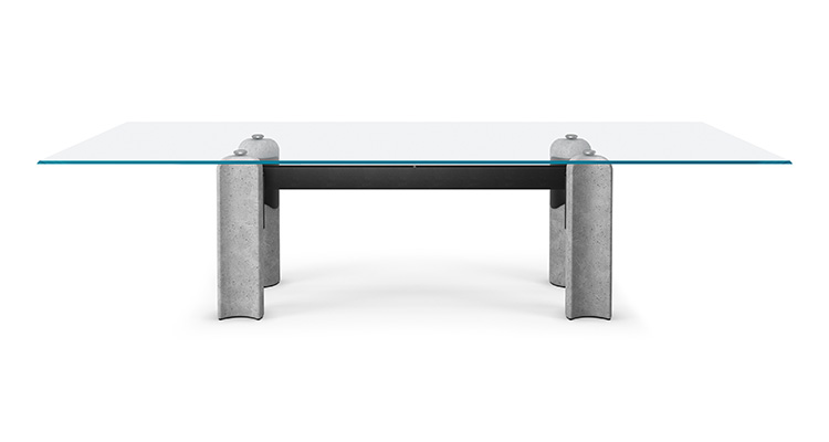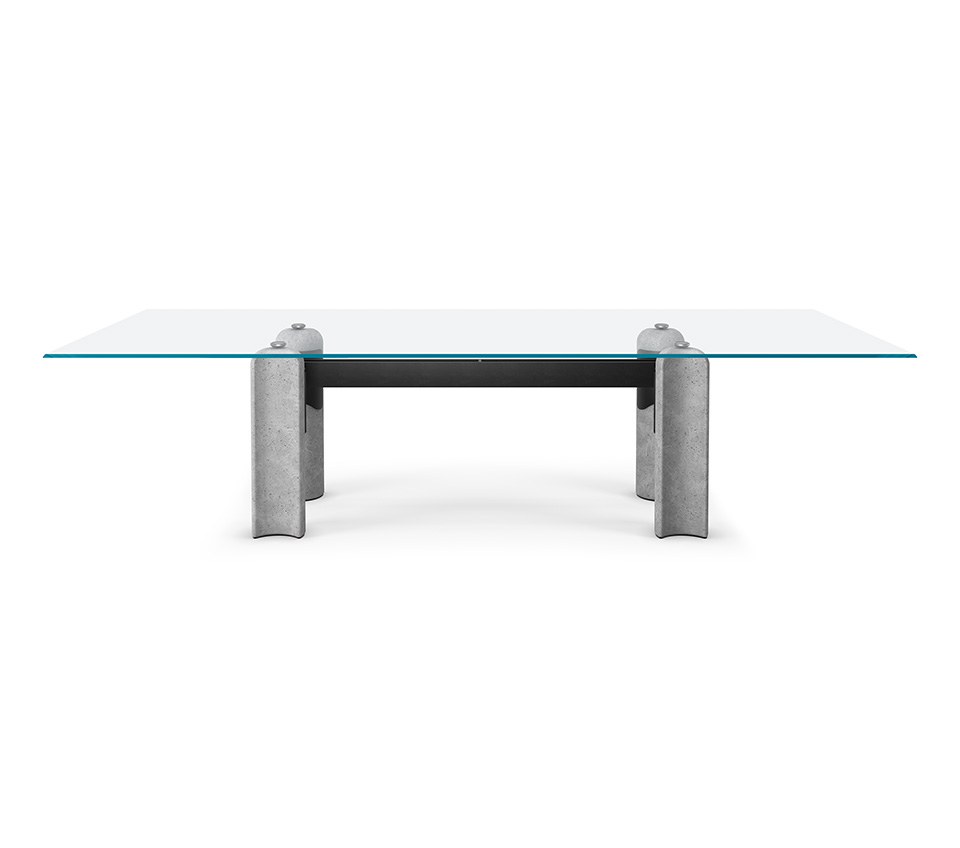 Brutalist-inspired design comes to life in the Bilbao Glass table with cement legs. The base consists of four lightweight cement pillars with a crescent-shaped section, joined by a metal cross-brace.