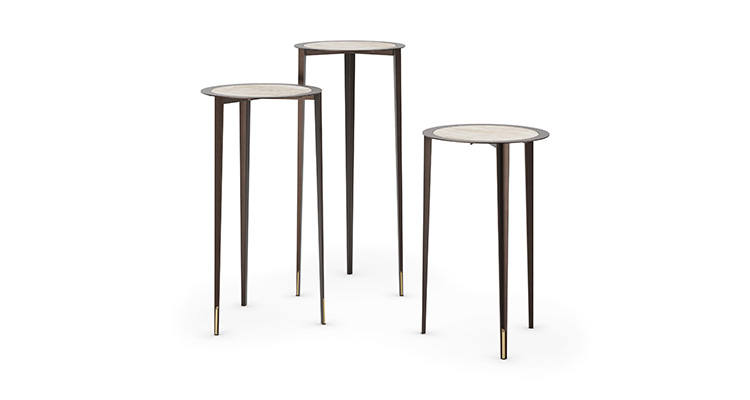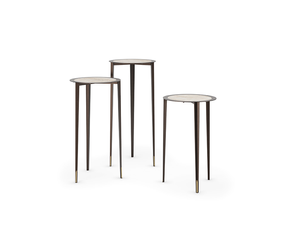 The legs, tapering downwards and angled sharply inwards, catch the light to create a choreography of highlights and shadows that enhances the precious finishes. Details and proportions are balanced with extreme care. This artisanal meticulousness is evident in the perfect harmony between the width of the metal rim, the diameter of the ceramic insert, and the dimensions of the slender legs.