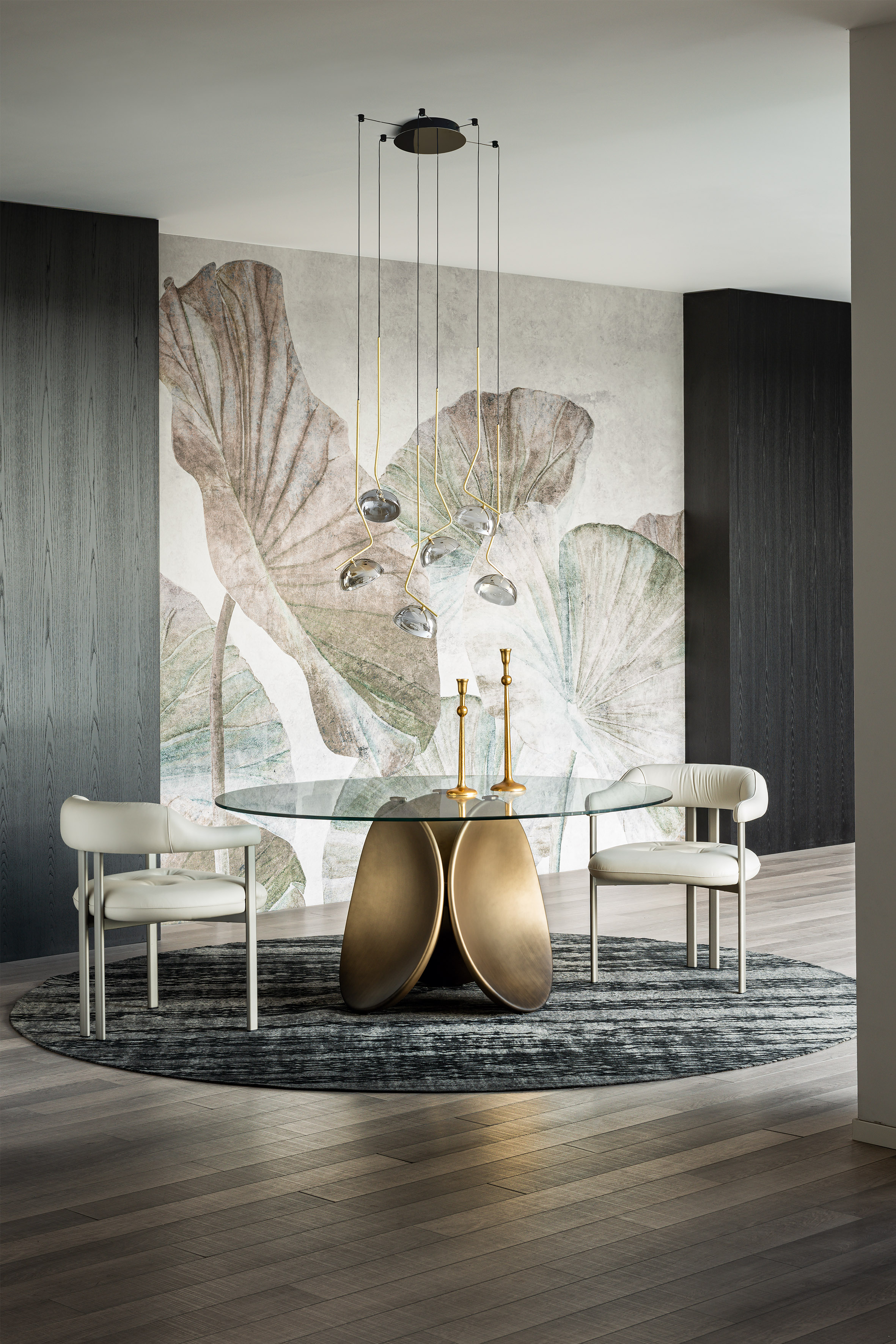 Maxim se realiza en dos versiones: una mesa redonda con sobre de vidrio transparente que permite apreciar la base escultural en su totalidad, y el modelo Maxim Argile completamente espatulado en arcilla, lo cual le brinda un aspecto aún más orgánico. “Cuando la materia basta a sí misma, sin superestructuras o agregados, se obtiene un objeto puro y directo que ya es un producto terminado”, afirman los diseñadores Pio y Tito Toso.