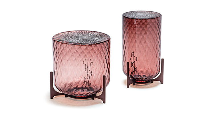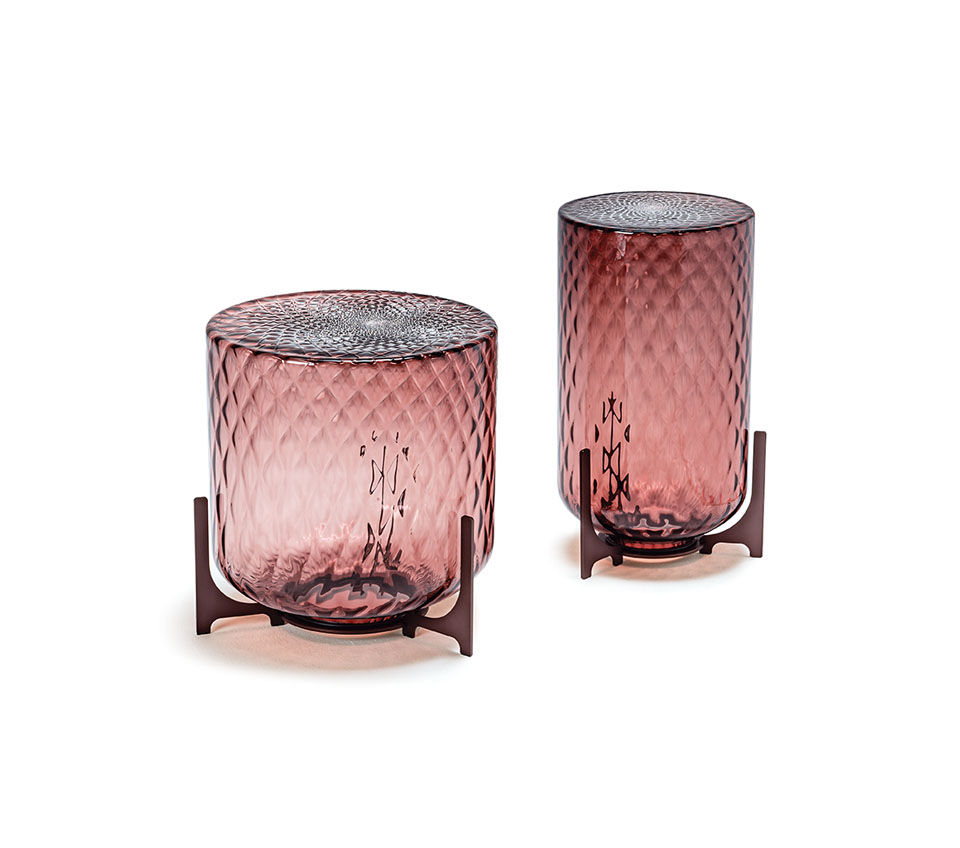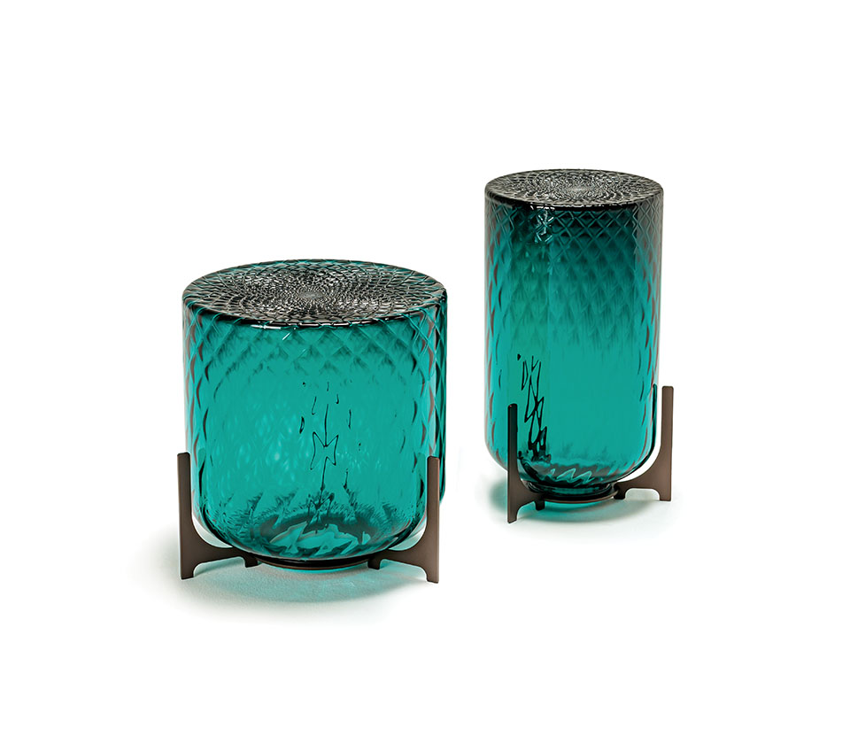 El cuerpo de la mesita de vidrio Dodo se caracteriza por un patrón tridimensional de rombos cruzados, obtenidos a partir de un molde de metal. Tras el soplado, las puntas presentes dentro del molde, modelan el vidrio fundido y realizan el típico efecto tallado de la elaboración balloton. En la parte superior, se crea un diseño en forma de mandala, levemente descentrado en el punto donde los rombos del molde se encuentran, realizando una decoración que recuerda los pétalos de una flor, o los esquemas perfectos, que evocan la tradición budista, con los cuales la naturaleza expresa su magnificencia.