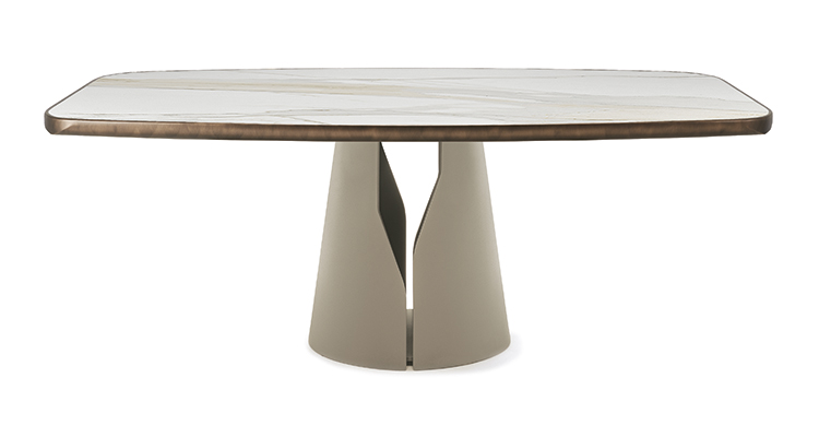 Mesa con base en acero barnizado gofrado titanio (GFM11), bronce (GFM18), graphite (GFM69), pearl (GFM70) o negro (GFM73). Sobre en cerámica Marmi colores Alabastro (KM02), Golden Calacatta mate (KM05), Golden Calacatta brillo (KM06), Portoro mate (KM07), Portoro brillo (KM08), Sahara Noir brillo (KM09), Makalu (KM11), Breccia (KM12), Borghini Calacatta opaco (KM18), Borghini Calacatta lucido (KM19), Colosseo (KM21), Andromeda (KM22), Invisible mate (KM24) o Luxor (KS23) y perfil inferior redondeado barnizado Brushed Bronze o Brushed Grey. Grosor sobre de 5 cm. Variaciones cromáticas y de cepillado del acabado Brushed son características de la producción artesanal y no deben considerarse como defectos.
