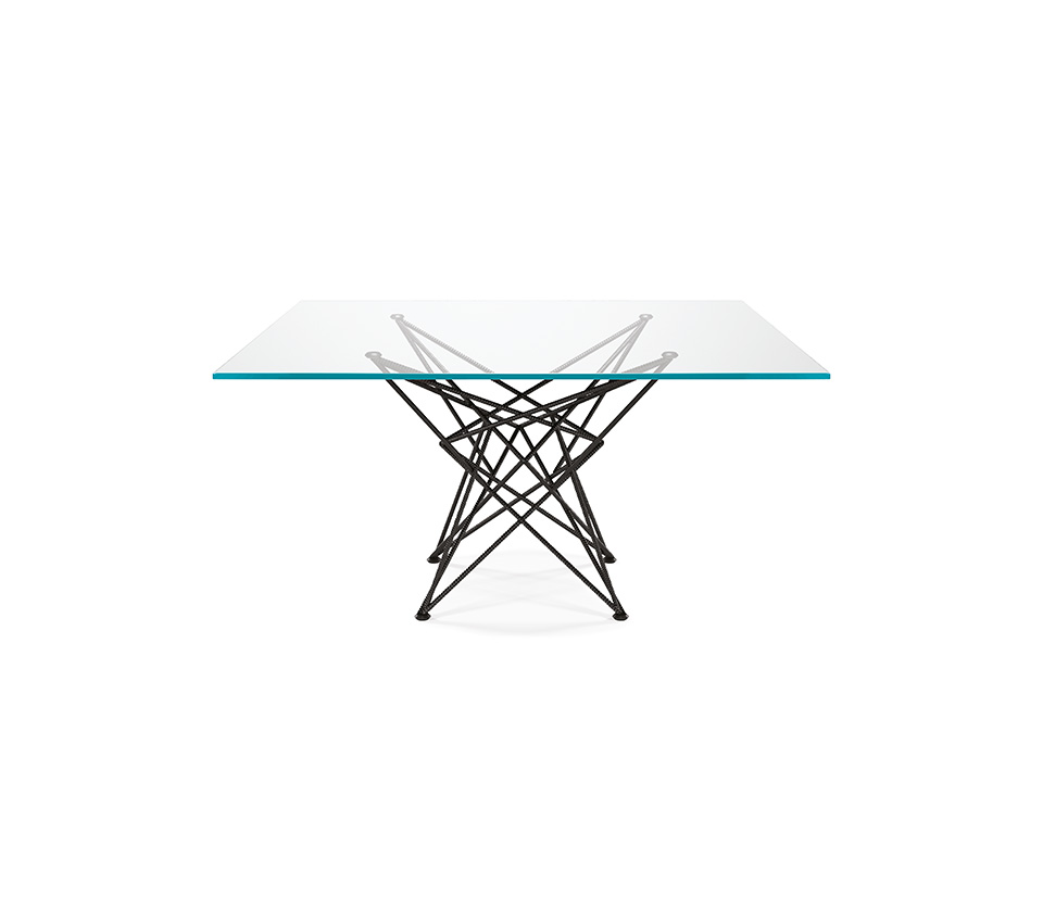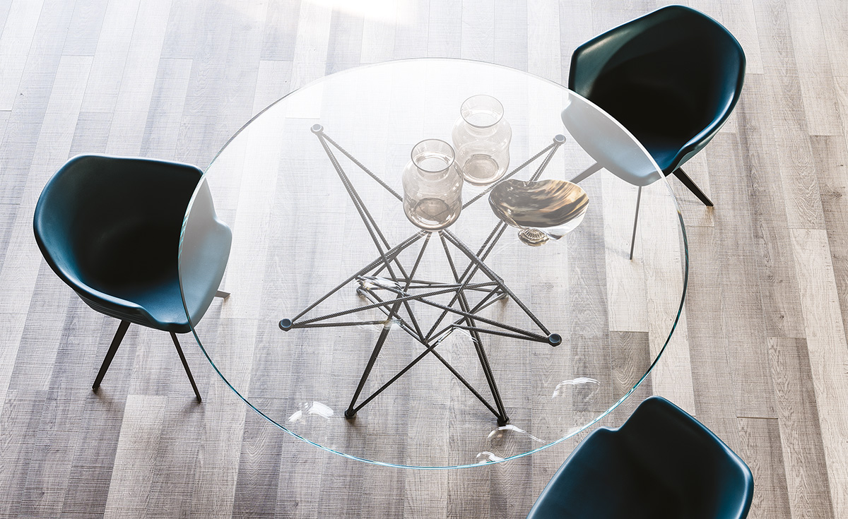 Mesa con base en acero barnizado gofrado titanio (GFM11), graphite (GFM69) o negro (GFM73). Sobre en cristal 15mm transparente, transparente extraclaro o transparente extraclaro con bordes biselados inversos (versión rectangular) o biselados (versión redonda). Los sobres 182x90cm y 200x106cm son de 12mm. Sobre en apoyo.