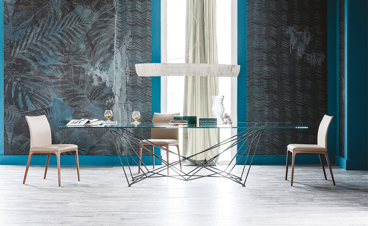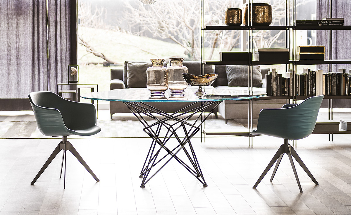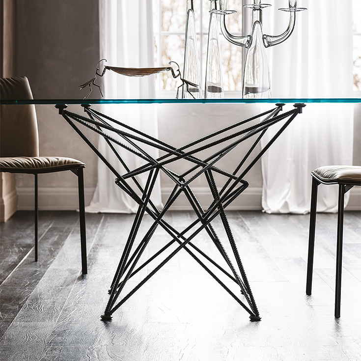 La familia de mesas modernas Gordon, diseñadas por Giorgio Cattelan, se presenta como una conjunción de líneas geométricas que se mueven de forma aparentemente caótica, mientras que, por el contrario, orden y diseño dan vida a una simetría perfecta. Este juego es aún más evidente en el modelo de la mesa redonda de vidrio, pero está disponible también de cerámica, en la cual, a la vista desde arriba, es posible reconocer la forma de una estrella tridimensional. Las versiones Gordon y Gordon Crystalart presentan ambas un sobre de cristal; la segunda se realza gracias a un grabado artístico decorativo. Además, se realizan las variantes Gordon Deep Wood con sobre de madera y bordes irregulares de gran robustez e imponencia, o bien, Gordon Keramik de cerámica Marmi, de numerosos tonos elegantes.
