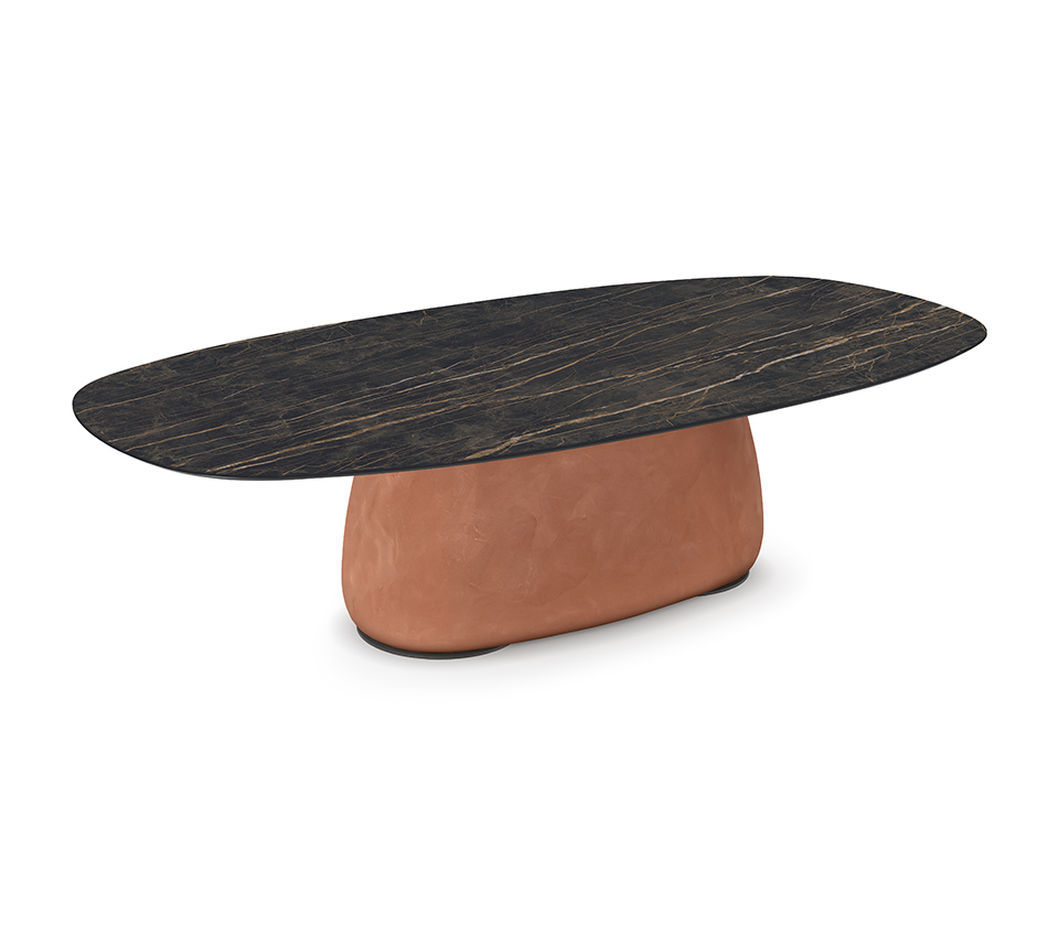 Mesa con base en polímero espatulada en arcilla en los colores Cairo (AR05), Oslo (AR09) o Marrakech (AR11). Placa de base en metal barnizado gofrado titanio (GFM11), bronce (GFM18) o negro (GFM73). Sobre en cerámica Marmi en los colores Alabastro (KM02), Golden Calacatta mate (KM05), Golden Calacatta brillo (KM06), Portoro mate (KM07), Portoro brillo (KM08), Sahara Noir brillo (KM09), Makalu (KM11), Breccia (KM12), Corcovado (KM14), Kaindy (KM16), Borghini Calacatta mate (KM18), Borghini Calacatta brillo (KM19), Colosseo (KM21), Andromeda (KM22), Invisible mate (KM24) o Luxor (KS23).