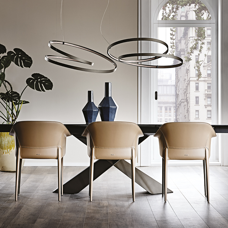La silla con apoyabrazos Zuleika, diseñada por el estudio Archirivolto, propone una estética tradicional, pero de una elegancia abrumadora. Las costuras en el perfil, realizadas del mismo color que el revestimiento de cuero integral, destacan las formas elaboradas que componen esta elegante silla de diseño. Las patas traseras que sobresalen del respaldo brindan un aspecto longilíneo a todo el asiento, para una apariencia más ligera.