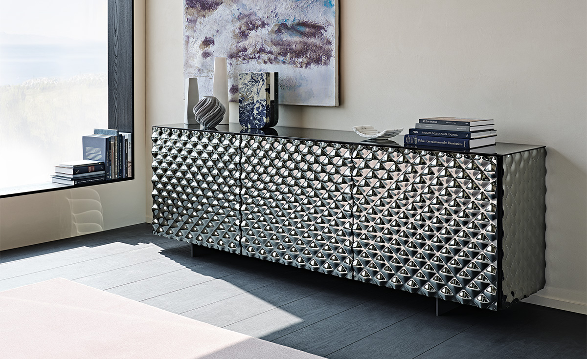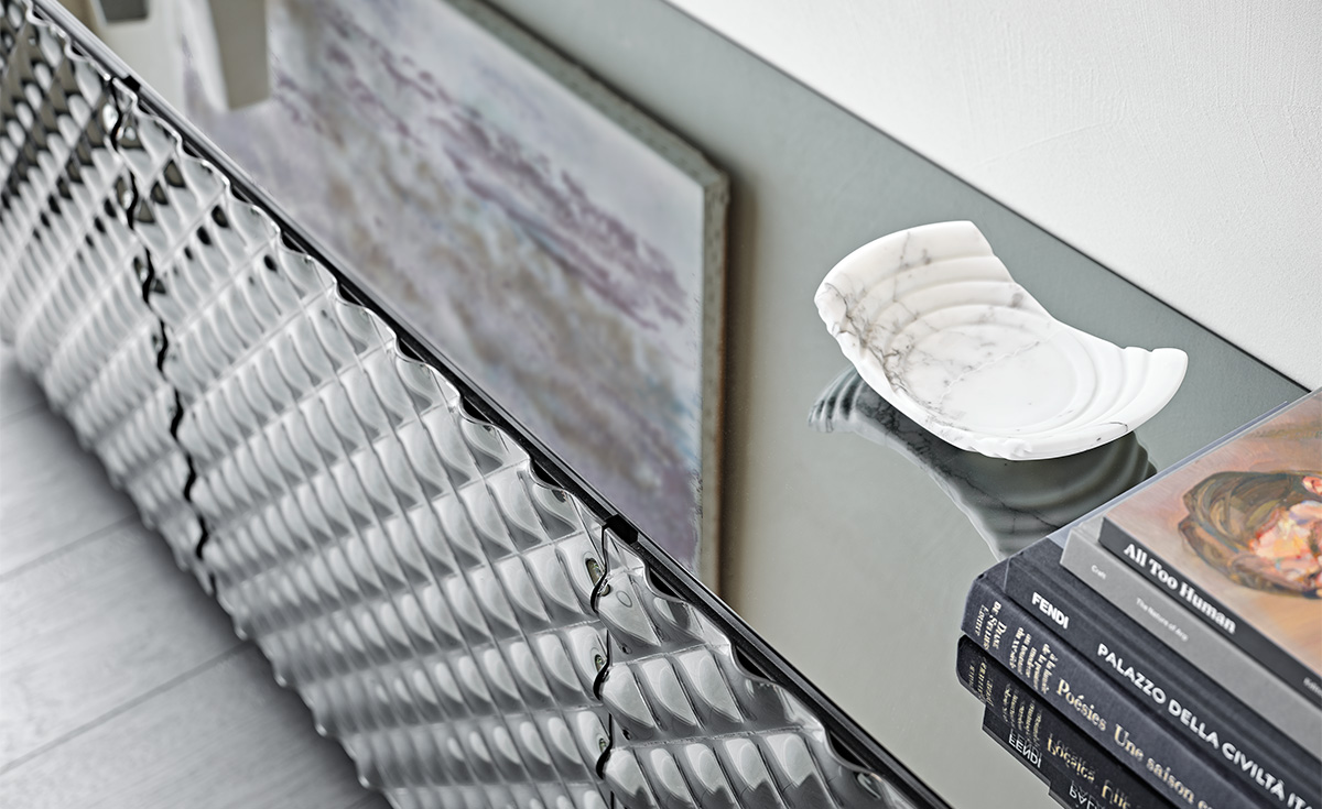 Realizado conjuntamente entre Paolo Cattelan y Lorenzo Remedi, el aparador moderno Vivaldi es dueño de un encanto hipnótico, sin igual . Las puertas crean un juego de luces difusas, donde se reflejan los objetos y las fuentes de luz alrededor. El acabado frontal de este aparador de diseño está constituido por cristal espejado couture, finamente elaborado. El cristal está modelado con una técnica sin precedentes, que permite dar a la superficie un efecto tridimensional, como una colchadura en un tejido. Para la superficie de apoyo se ha escogido el cristal, que refleja los objetos exhibidos en este seductor aparador espejado.