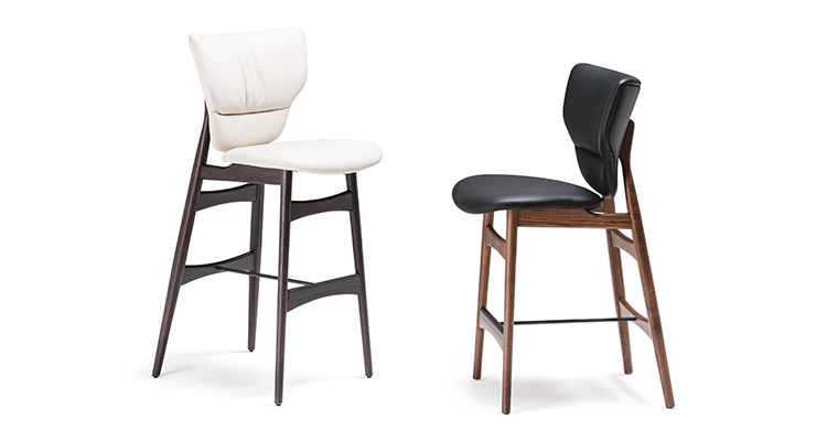Taburete con estructura en fresno barnizado nogal Canaletto (frNC), fresno barnizado roble ahumado (frRB), fresno barnizado negro (fr73) mate a poro abierto. Asiento y respaldo tapizados en tejido, ecopiel o piel según muestrario.